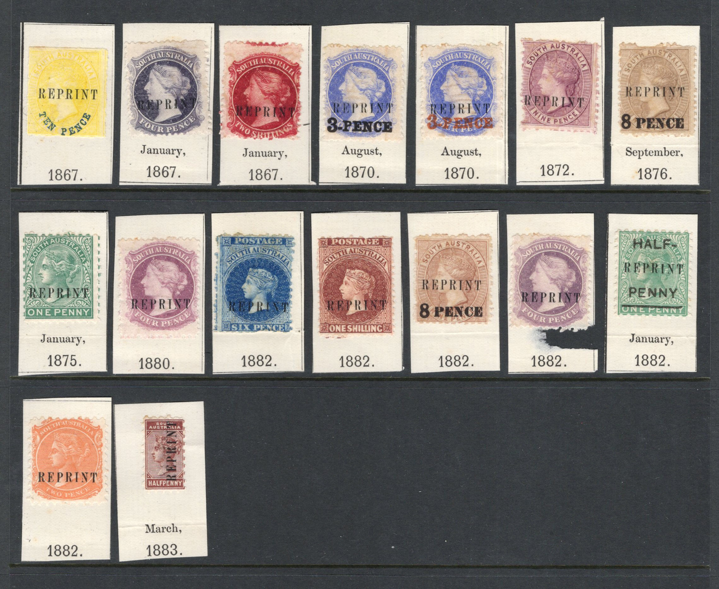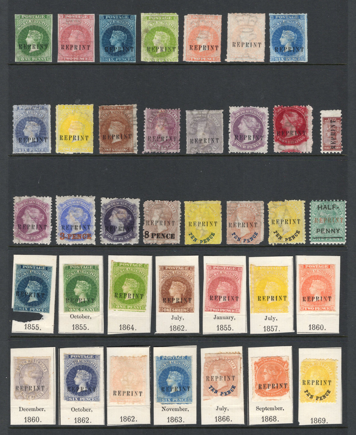 860 og   imagePart Set of 1855-1891 South Australia Issues with REPRINT Overprints, with 53 mostly different issues, all watermarked Crown and SA, 30 of which are stuck to their original backing, fine. (Scan 1) (Scan 2) (All Scans)