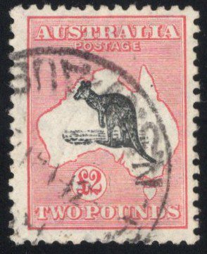 842 O 129 image1934 £2 Dull Rose and Black Kangaroo and Map, Small Crown and Multiple C of A Watermark, used with c.d.s. cancel, fine-very fine. Accompanied by a 2021 American philatelic Society certificate.