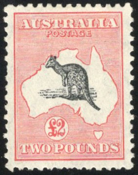 841 og 129 image1934 £2 Dull Rose and Black Kangaroo and Map, Small Crown and Multiple C of A Watermark, mint lightly hinged, with a few irregular perfs, still well centered and very fine.