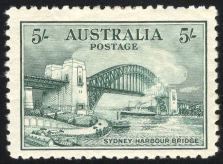 843 og 132 image1932 5sh Grey Green Sydney Harbor Bridge, mint hinged (remnant) with large margins, very fine.