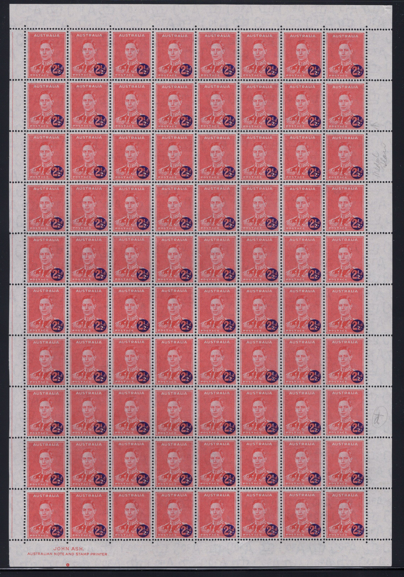 846 nh 188 var image1941 2½d on 2d Red King George VI Surcharge with "Medalion Flaw", a mint never hinged sheet of 80 (right pane), showing the constant plate variety (a.k.a. "Medal Flaw") in position 2/5, with John Ash imprint at lower left. The stamp in position 8/3 also shows a "slashed "d" of the surcharge variety (unlisted). A very fine and fresh sheet (never been folded), rarely offered and the best possible way to collect this variety. S.G. 200b, £450 (£529 for the sheet). (Scan 1) (Scan 2) (Scan 3) (All Scans)