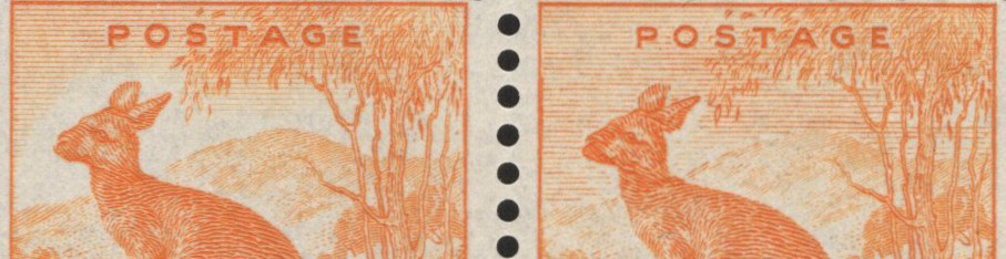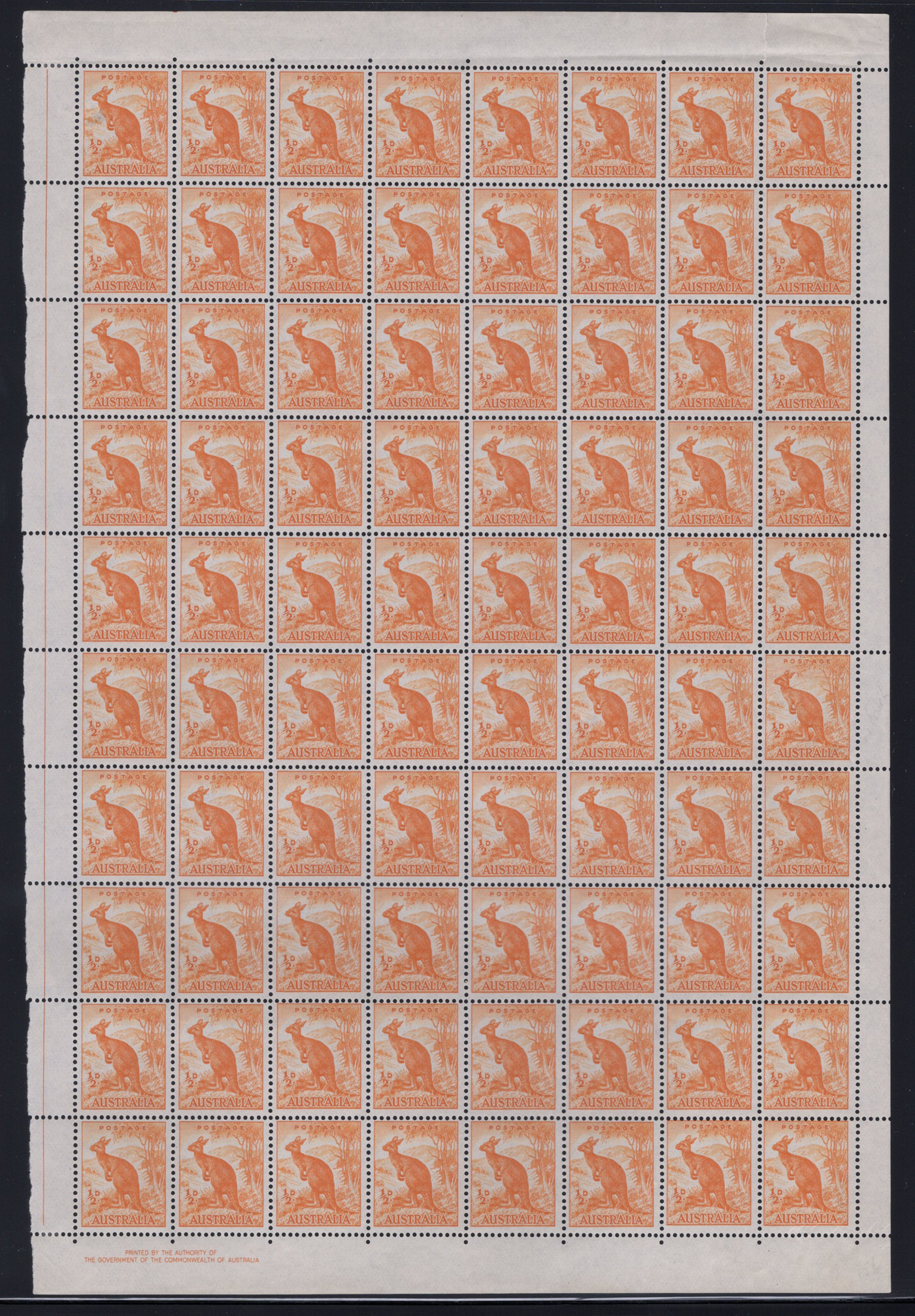 850 nh 223A var image1949 ½d Orange Kangaroo, Unwatermarked, with "Sky Retouch", a mint never hinged sheet of 80 (right pane), clearly showing the constant plate variety in position 6/8 as well as the printer's imprint at lower left. We also noticed a flaw in position 9/4 "line to left of ear" (and probably others). Small tear in margin at top, still very fine and rarely offered, a great way to collect this variety. S.G. 228b, £60 (undervalued, in our opinion). (Scan 1) (Scan 2) (All Scans)