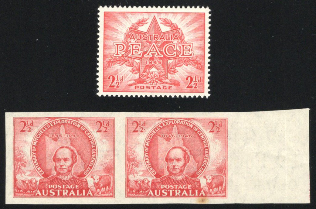 848 nh 200 var, 203 var image1946 2½d Peace and Victory Issues Varieties, both mint never hinged, includes a very fine 1946 2½d carmine Peace issue unwatermarked (Scott 200 var), as well as a 1946 2½d dark carmine Sir Thomas Mitchell imperforate (plus watermark inverted) pair with sheet selvedge at right (right stamp has a rust spot at bottom). These curiosities are quite scarce and usually command high prices, and would make a nice collateral addition to any specialized collection.