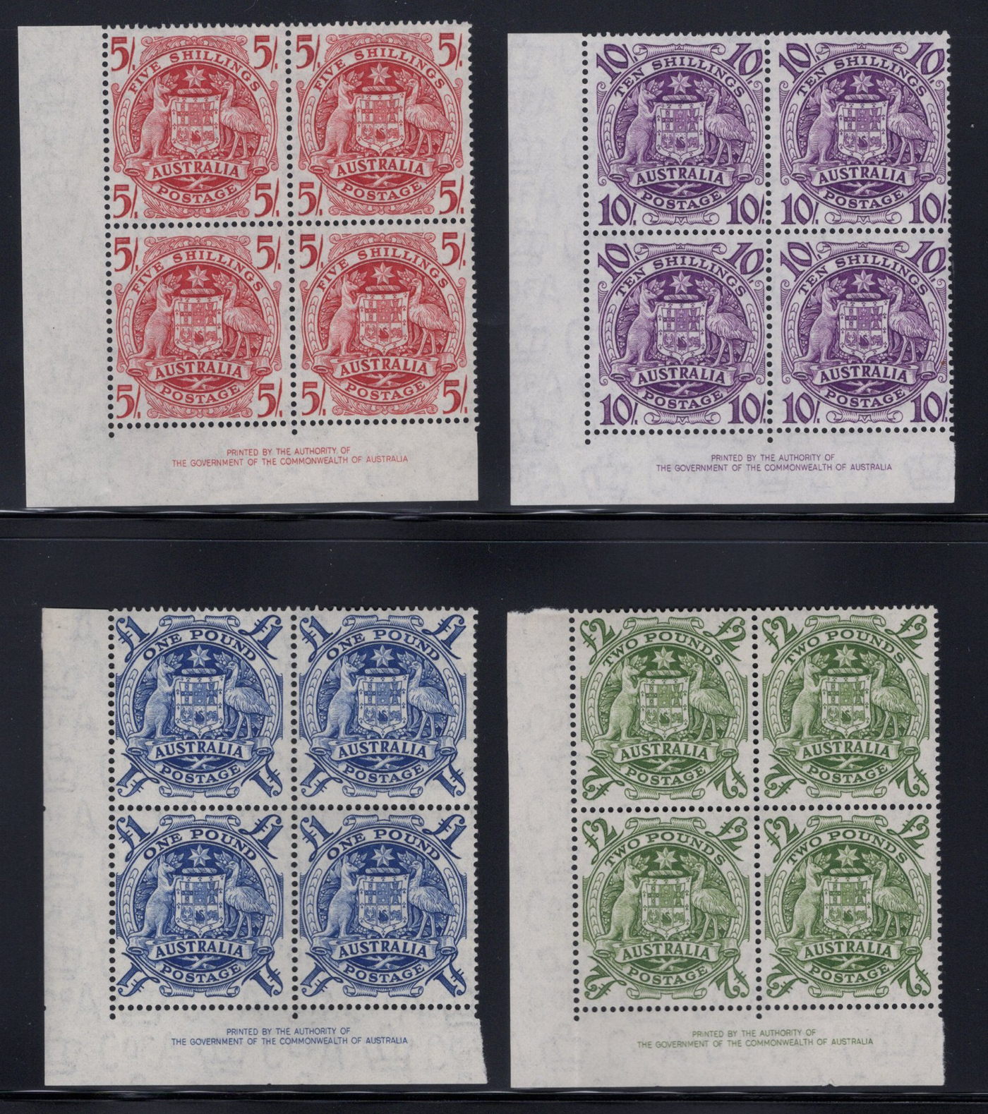 849 og/nh 218-221 image1949-50 5sh to £2 Arms of Australia Set, each value is in a mint lower left corner plate block of four, 5sh has one lightly hinged stamp and £2 has two top stamps lightly hinged, rest are never hinged. A fresh and very fine set, rarely offered in this iteration. Catalogue value is for single stamps only.