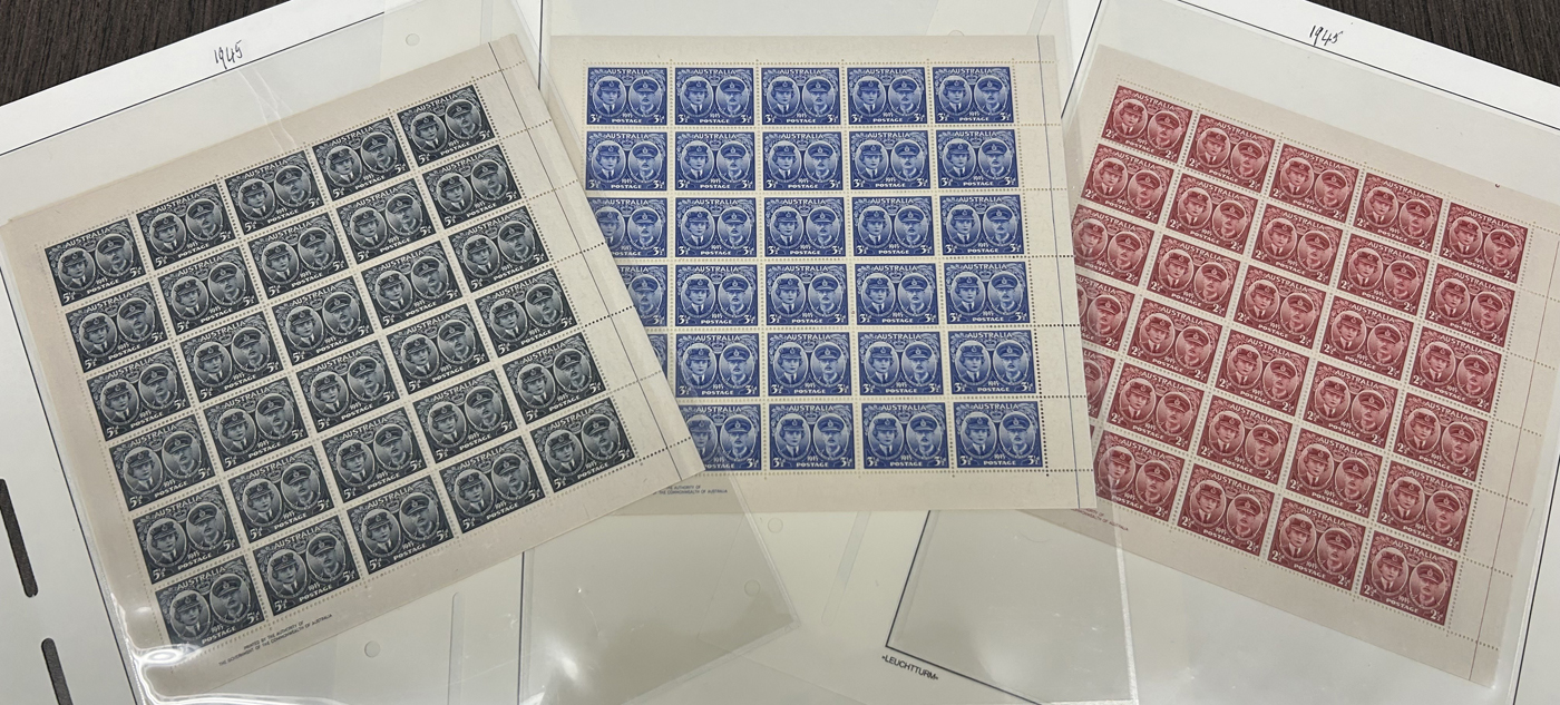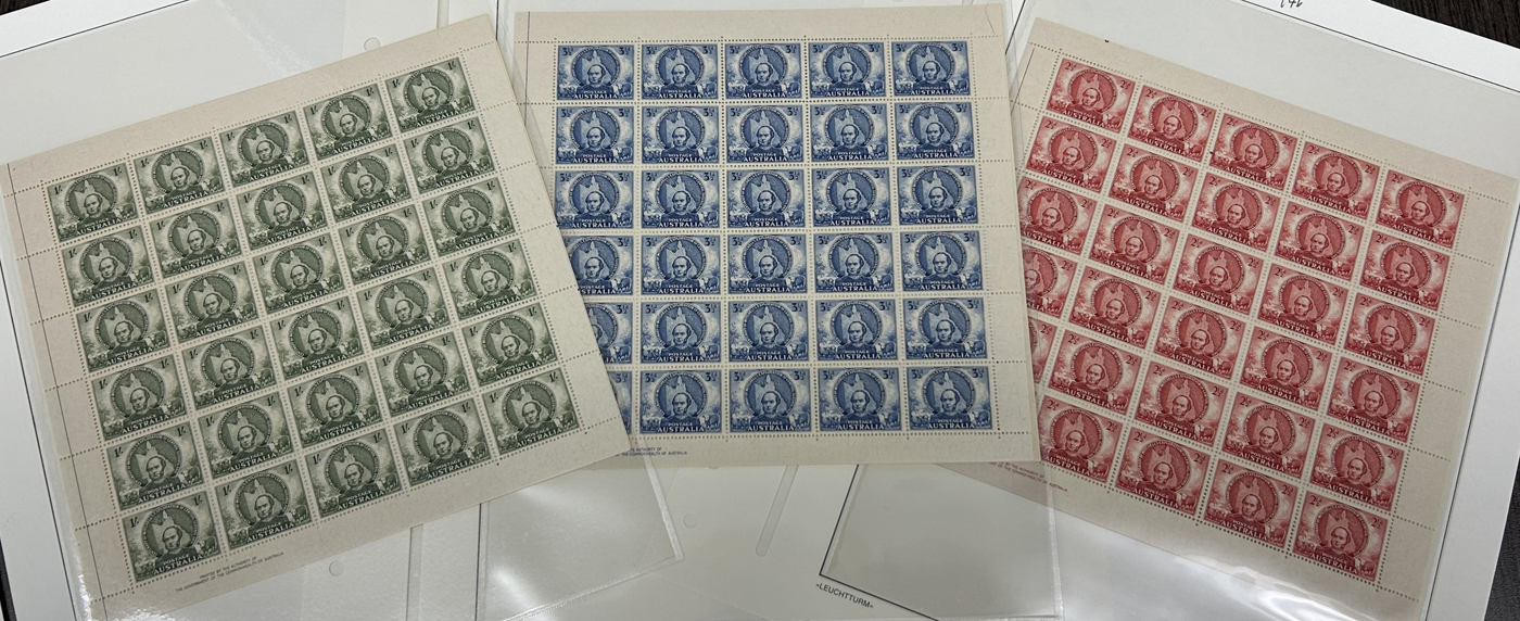847 nh 197-199, 203-205 image1946-46 Two Complete Sets in Sheets of 30, the 1945 Duke and Dutchess of Gloucester, and the 1946 Sir Thomas Mitchell and Map of Queensland, both in complete sets of three values, all in mint never hinged sheets of 30. First set are all left panes with gutter line at right and imprint lower left, and the second set are all right panes with gutter line at left and imprint at left. All fresh and very fine. A great collateral group to any collection. (Scan 1) (Scan 2) (All Scans)