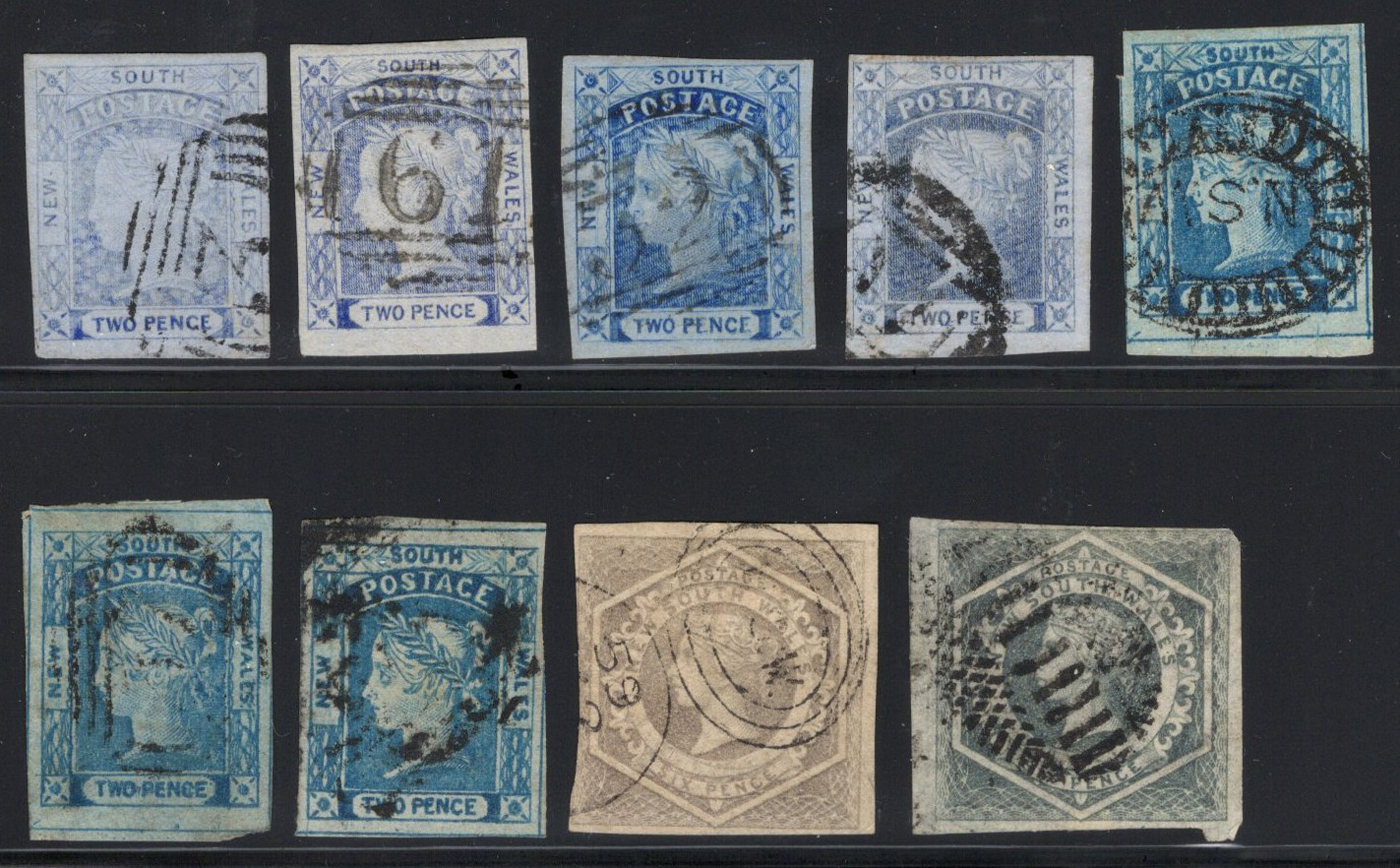 855 O   imageSelection of 9 Classic New South Wales Issues, all used, with Scott #s 11 (x2 slightly different shades), 14, 14c, 16, 24, 24a, 28 and 29. A sound group (#29 has a tiny corner crease in margin only), with a variety of postmarks, overall fine to very fine.