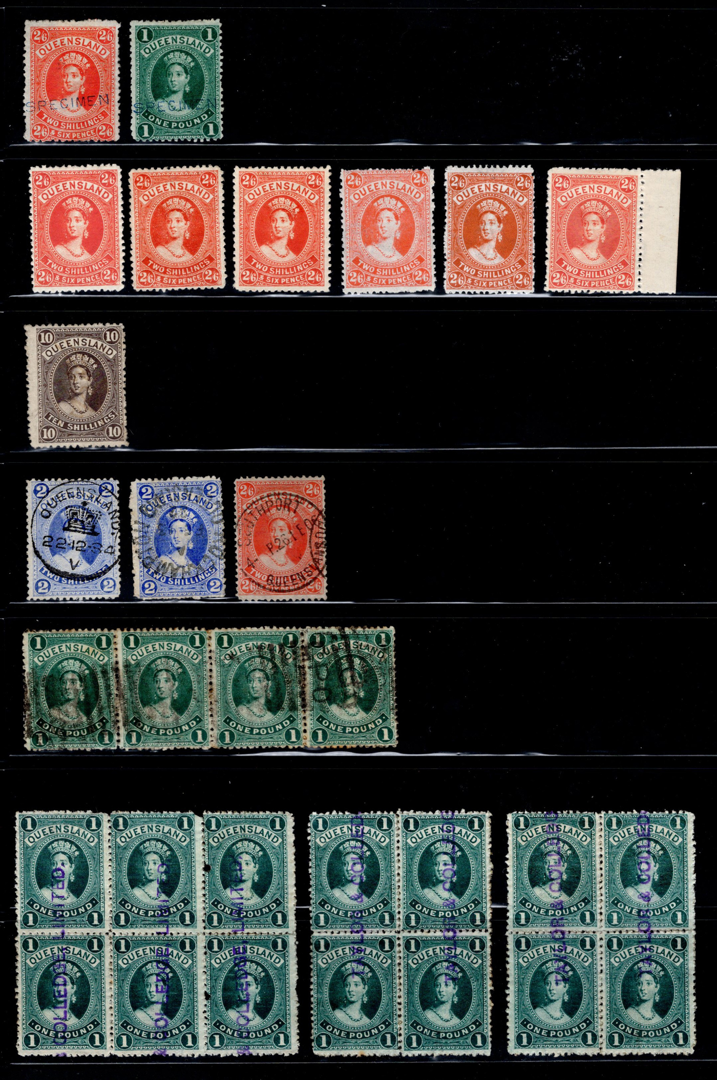 856 O   imageCollection of High Denomination Queen Victoria Large Chalon Portrait Issues, with 30 stamps, including Scott 80, 83 / SG 158,161 both with SPECIMEN overprint), a group of 6 mint 2sh values (different shades, papers and watermarks), a mint 10sh value, three used singles with socked on the nose town cancels (two 2sh blue and a 2sh6d), a used strip of 4 of the £1, and a group of £1 blocks of 4 (x2) and 6 with revenue cancels. A fine to very fine group, ideal for the specialist.