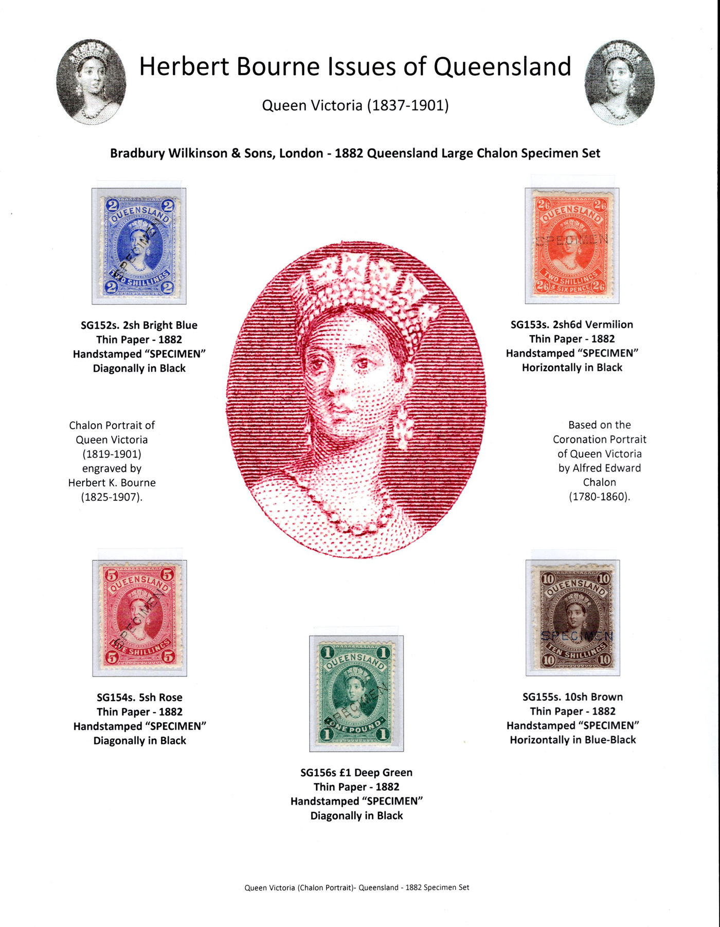 858 ng 152s-156s (SG) image1882 2sh to £1 Queen Victoria Large Chalon Set with SPECIMEN Overprints, unused (no gum), neatly mounted on an elaborate album page, each value has a sans-serif SPECIMEN overprint (three diagonal, two horizontal) fresh and generally fine. SG 152S-156S, with a catalogue value of £300 for a set of 4 (without the 2sh6d, which is unlisted).