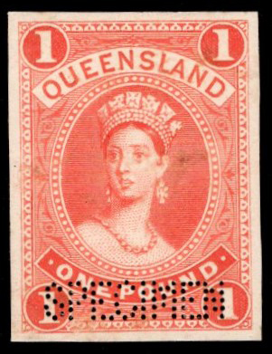 859 E/P 156P (SG) image1882 £1 Queen Victoria Large Chalon Plate Proof in Vermilion, with Perforated SPECIMEN, a "printer's sample" from the engraved die printed on thin card, with light surface marks, still a rare item. Accompanied by the original Stanley Gibbons sales card when it sold for £450 (noting that "a similar item sold for £496 in the Alan Griffiths Queensland sale in 2012")