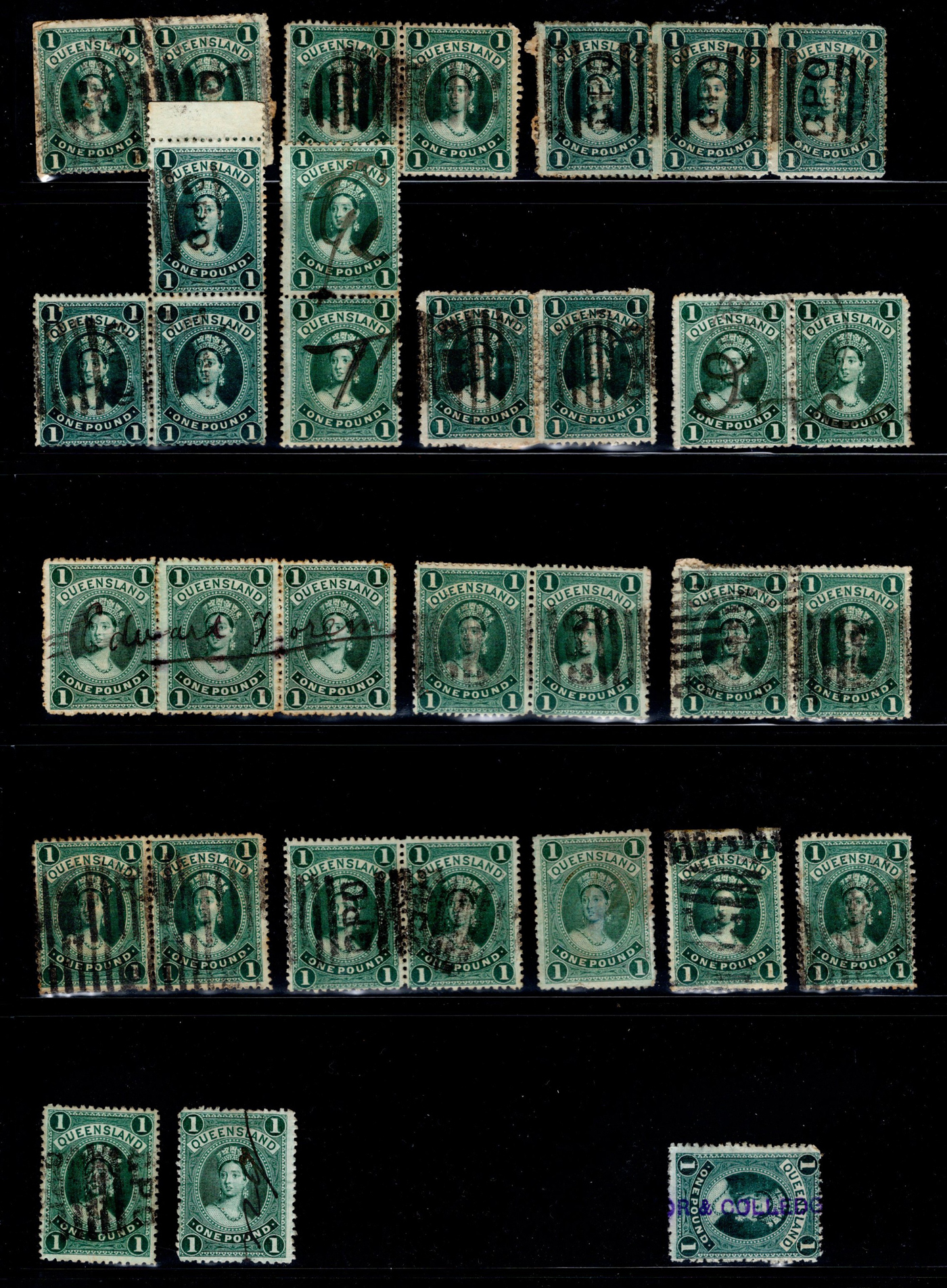 857 O   image1882-1907 £1 Queen Victoria Large Chalon, a group of 32 used stamps, mostly in singles and pairs, with various GPO or other postal cancels, overall fine. Scott catalogue value would be $2,560, if all Scott #83, the least valuable printing. Also includes a single with a revenue cancel.