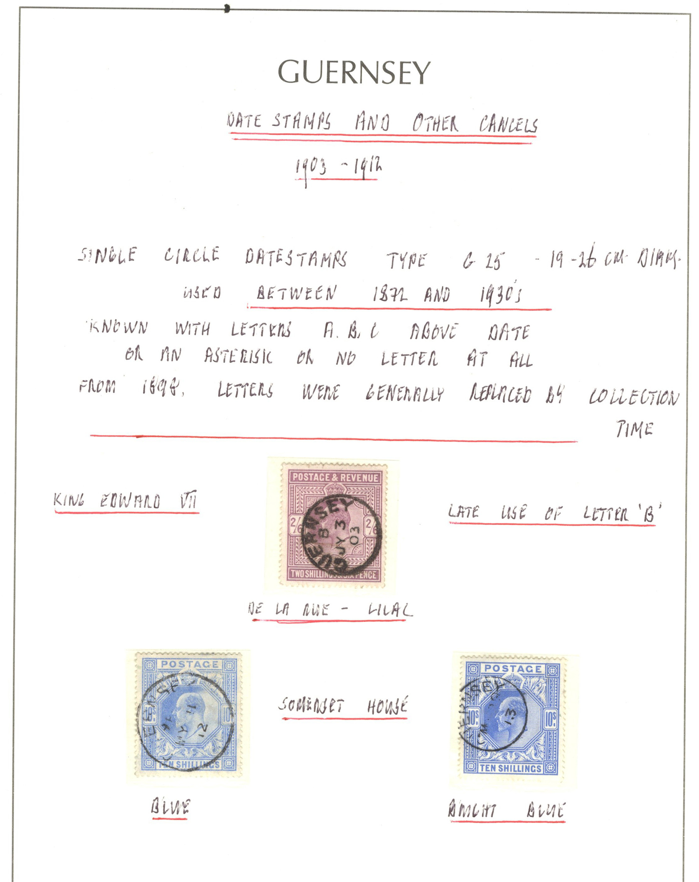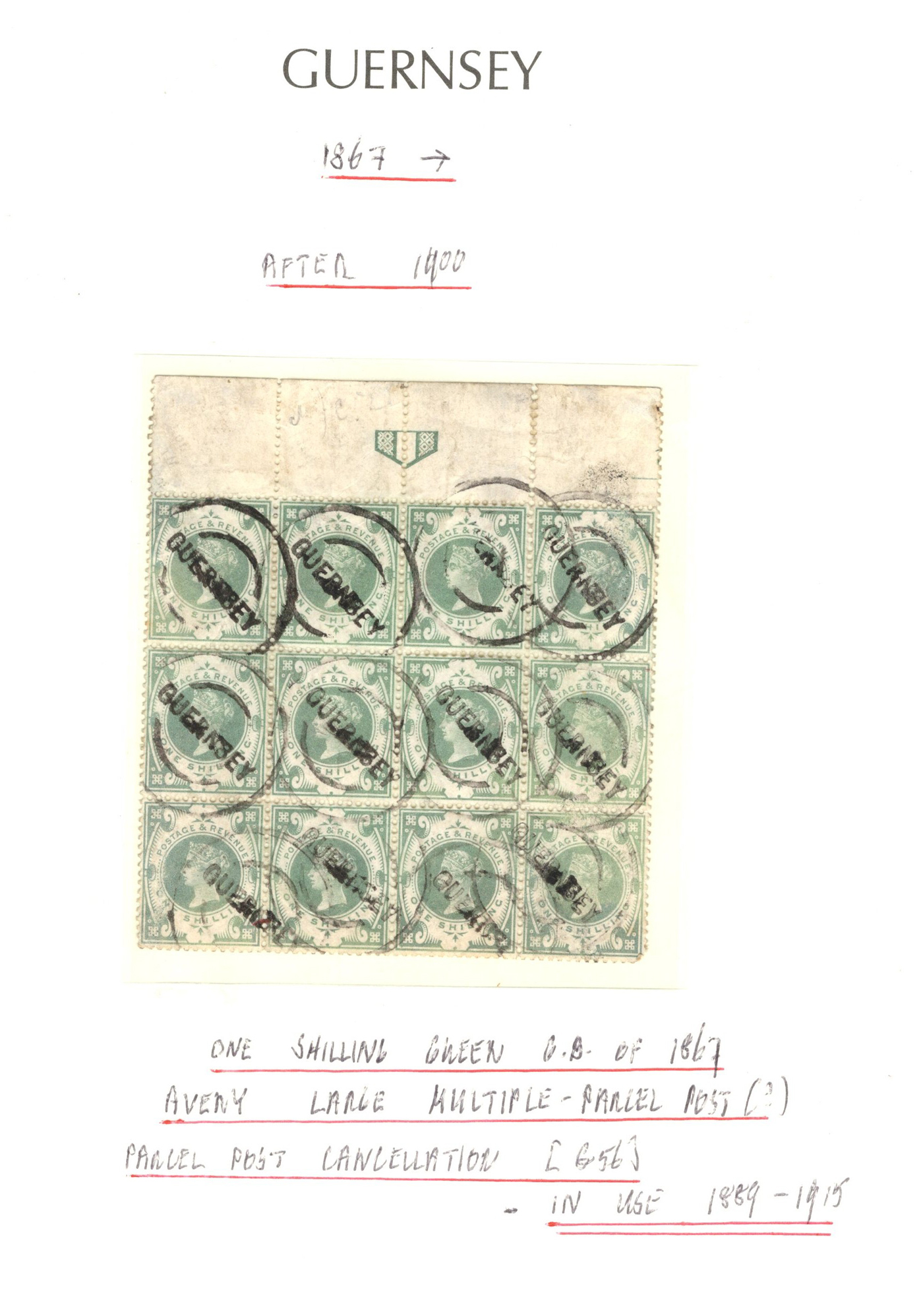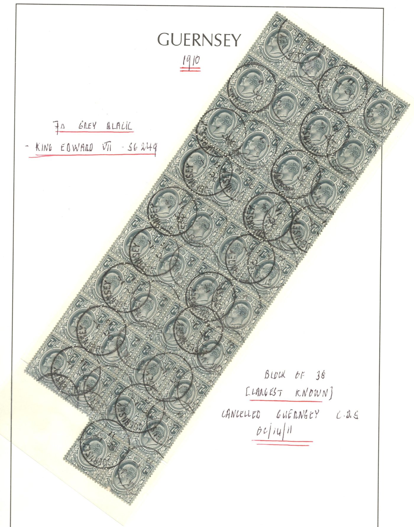 914 O   imageGroup of Great Britain Stamps Used in Guernsey, 1903-1913, with Scott #s 122 (1sh green QV) upper margin block of 12) with Guernsey parcel cancel (slight soiling from parcel), 139 (2sh6d lilac KEVII) used in 1903, 141 (10sh ultramarine KEVII) used in 1912, 141a (10sh bright ultramarine KEVII) used in 1913 and 145b (7d slate grey KEVII) block of 38 used in 1911, described by owner as largest known used block. A fine to very fine group. (Scan 1) (Scan 2) (Scan 3) (All Scans)
