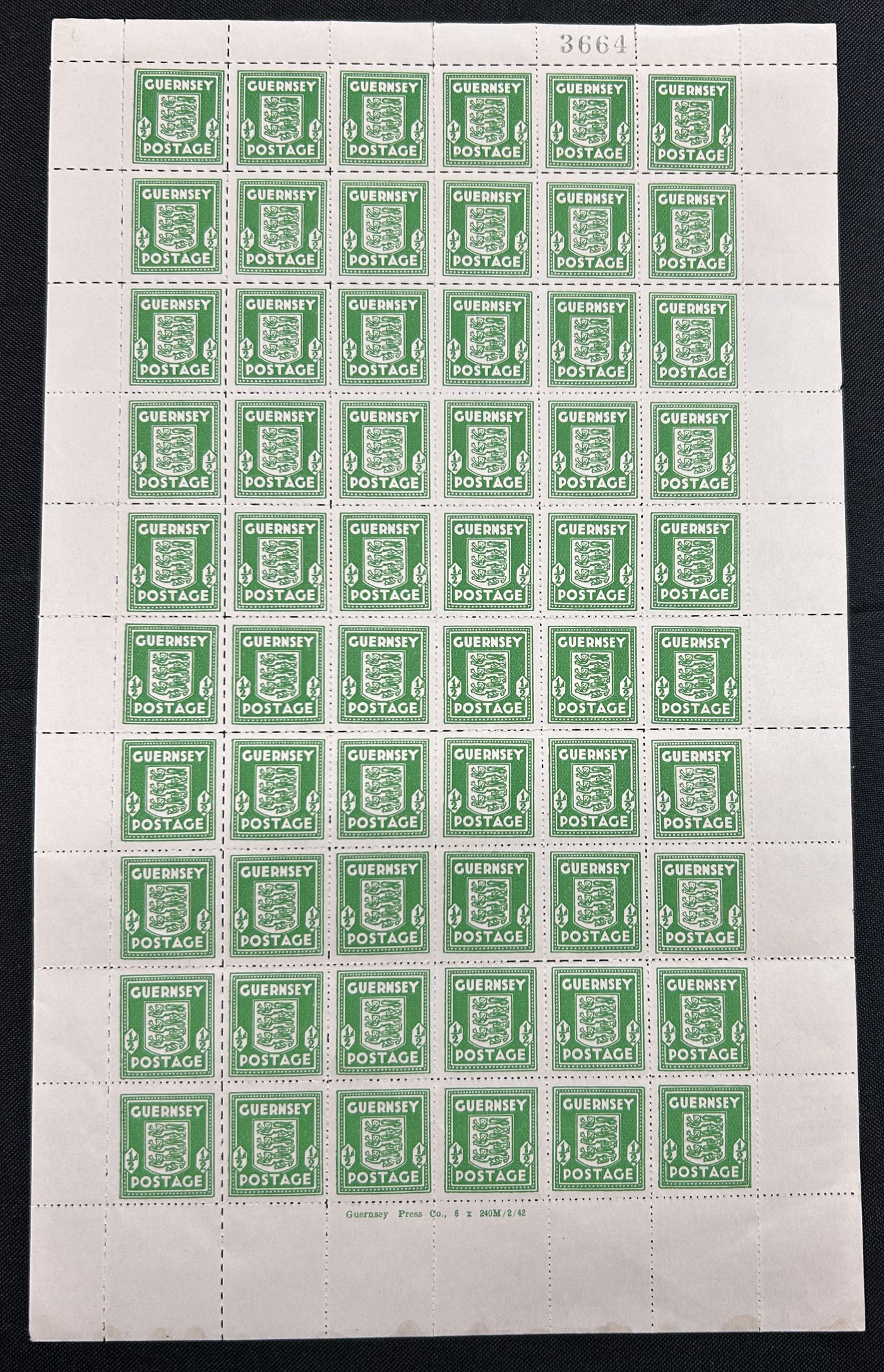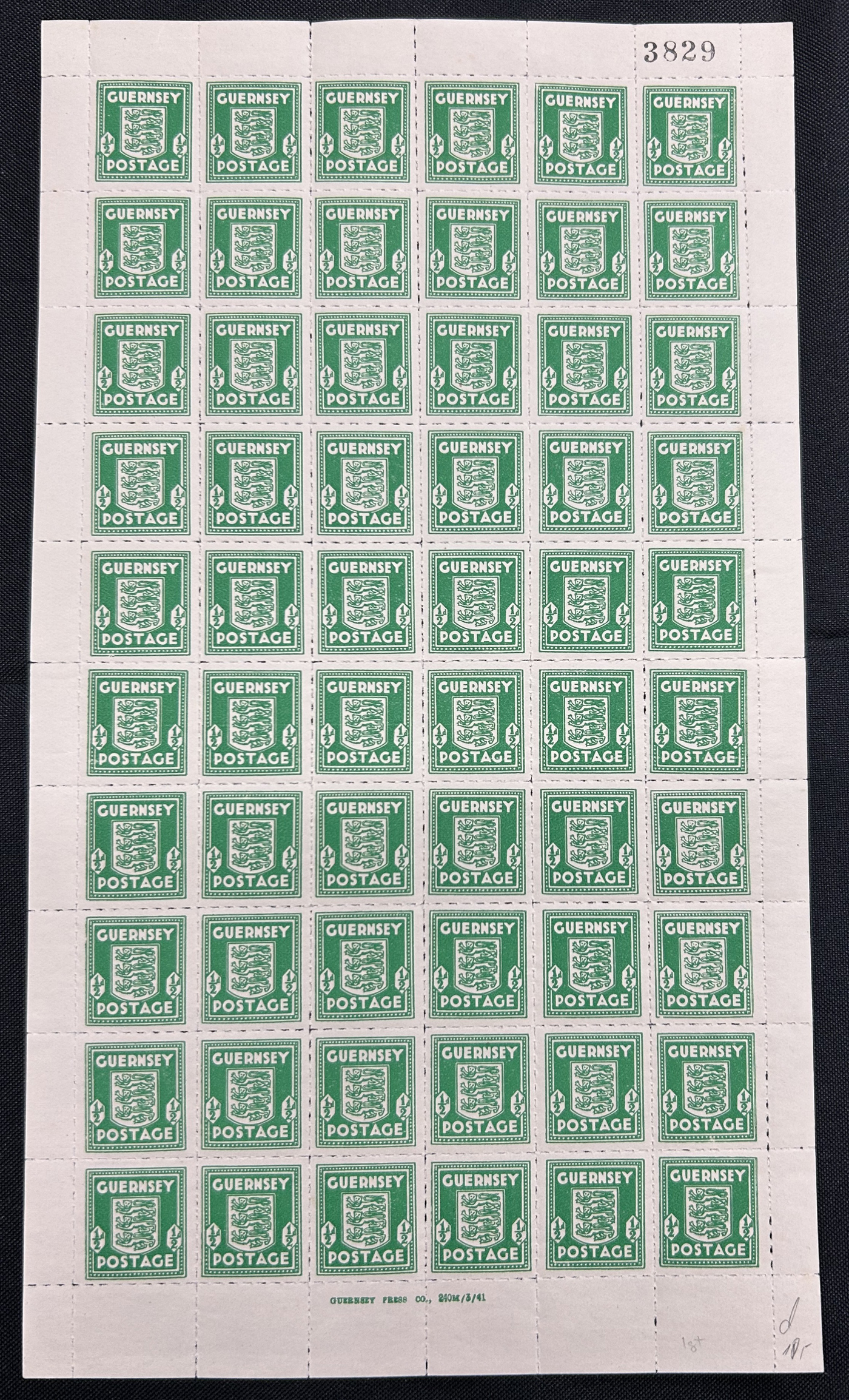 918 nh N1 image1941 ½d Green Arms of Guernsey Occupation Issue, 1st Printing, a mint never hinged pane of 60, with sheet number at top and "GUERNSEY PRESS Co., 240M/3/41" plate imprint at bottom, very fine.