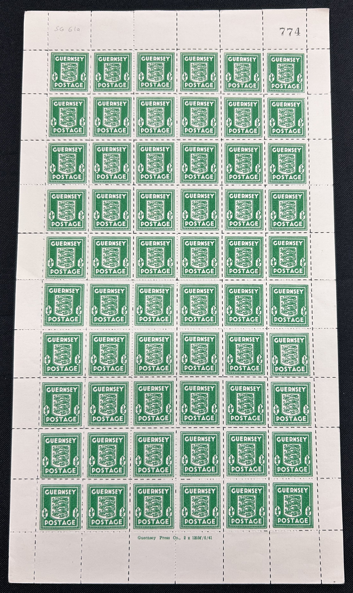 919 nh N1 image1941 ½d Green Arms of Guernsey Occupation Issue, 2nd Printing, a mint never hinged pane of 60, with sheet number at top and "Guernsey Press Co., 2 x 140M/6/41" plate imprint at bottom, very fine.
