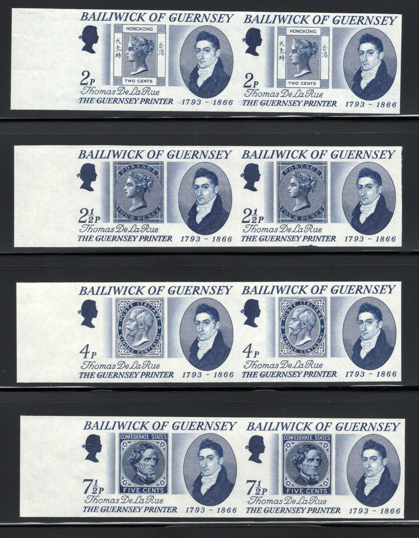 915 E/P 56P-59P image1971 2p to 7½p Thomas De La Rue Set of Plate Proofs in Black Blue, each is on an ungummed sheet margin horizontal pair, the 2½p has once been folded vertically between both stamps, still very fine. A remarkable offering, ideal for the Guernsey or British Commonwealth collector, as much as the De La Rue, or "stamp on stamp" topicalist.