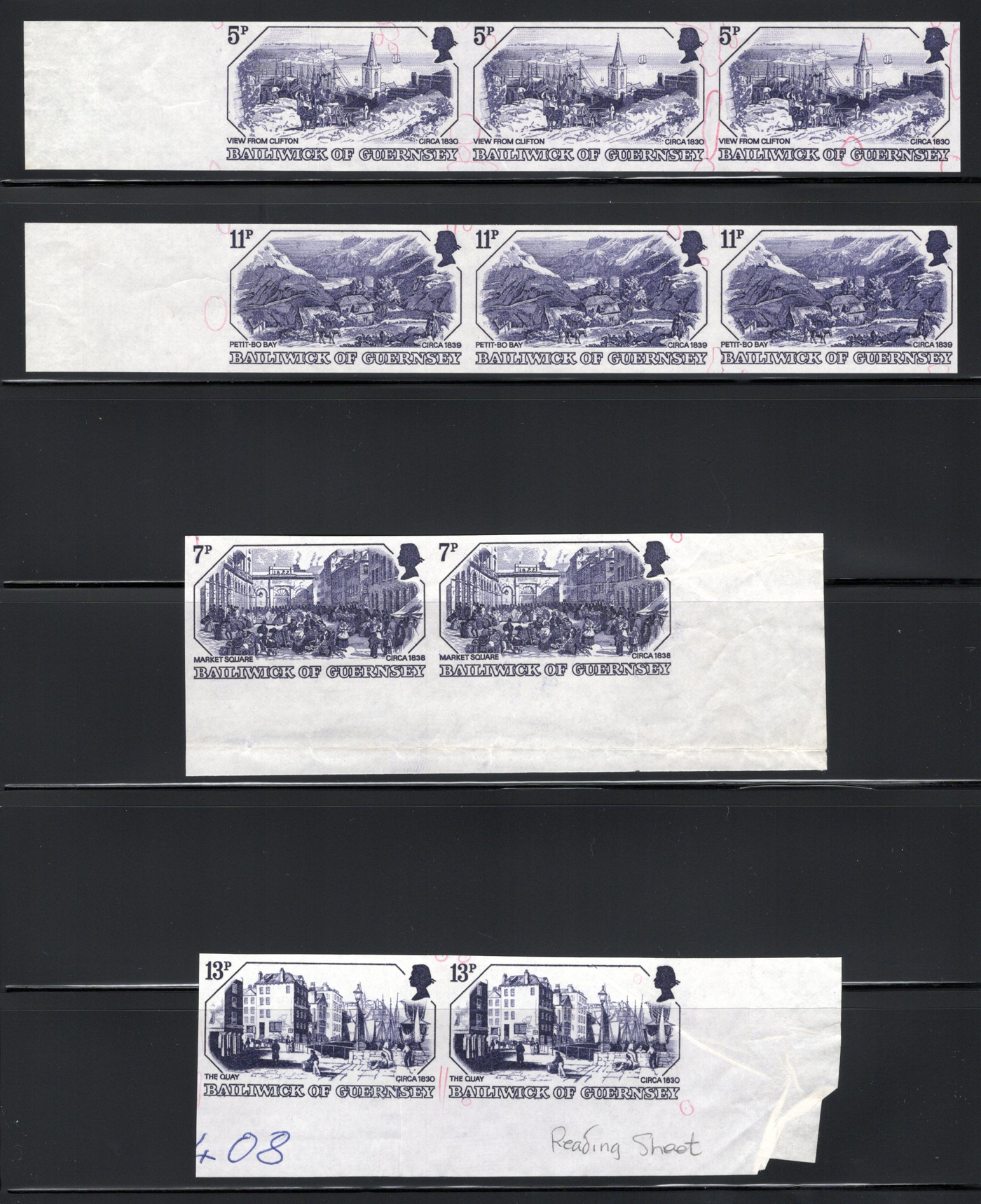 916 E/P 157P-160P image1978 5p to 13p 19th Century Prints Set of Plate Proofs in Black Blue, each value is on ungummed paper in a sheet margin horizontal pair (the two low values are in strips of three), with red pen circles showing the various flaws the engraver had to then fix. The high value has the notation "Reading Sheet" at lower right next to a number in blue pen. All four values have various wrinkles, still scarce and fine.