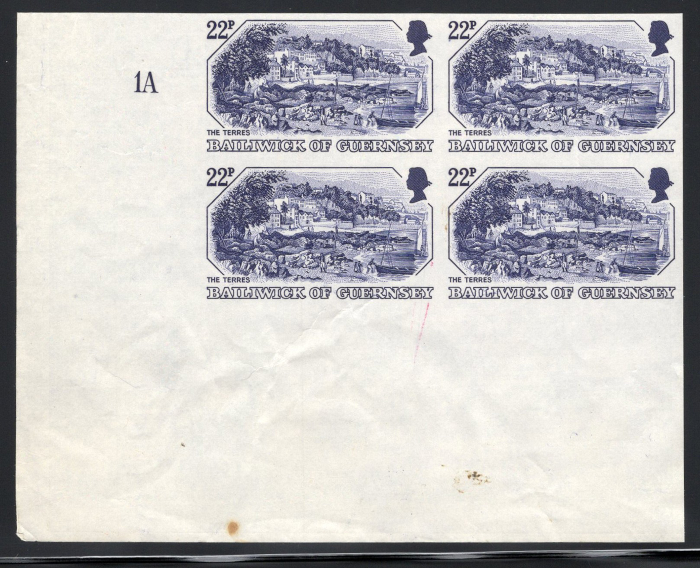 917 E/P 238P image1982 22p 19th Century Prints "The Terres" Plate Proof in Black Blue, a lower left corner plate 1A block of four, on ungummed paper. Various wrinkles, and small stains in lower margin, still scarce.