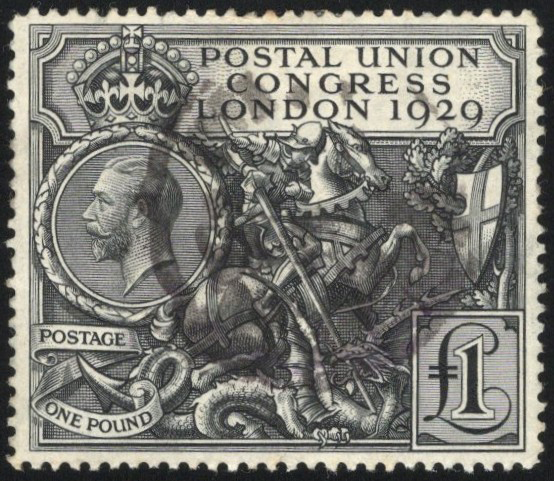 912 O 209 image1929 £1 Black St George Slaying the Dragon, used with indistinct cancel, fine-very fine.