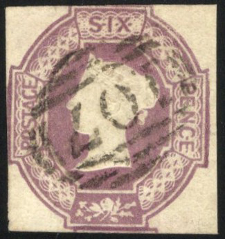 903 O 7 image1854 6d Red Violet Queen Victoria Embossed Imperforate, used with neat numeral 107 grid cancel, bright colour and well centered for issue, fine.