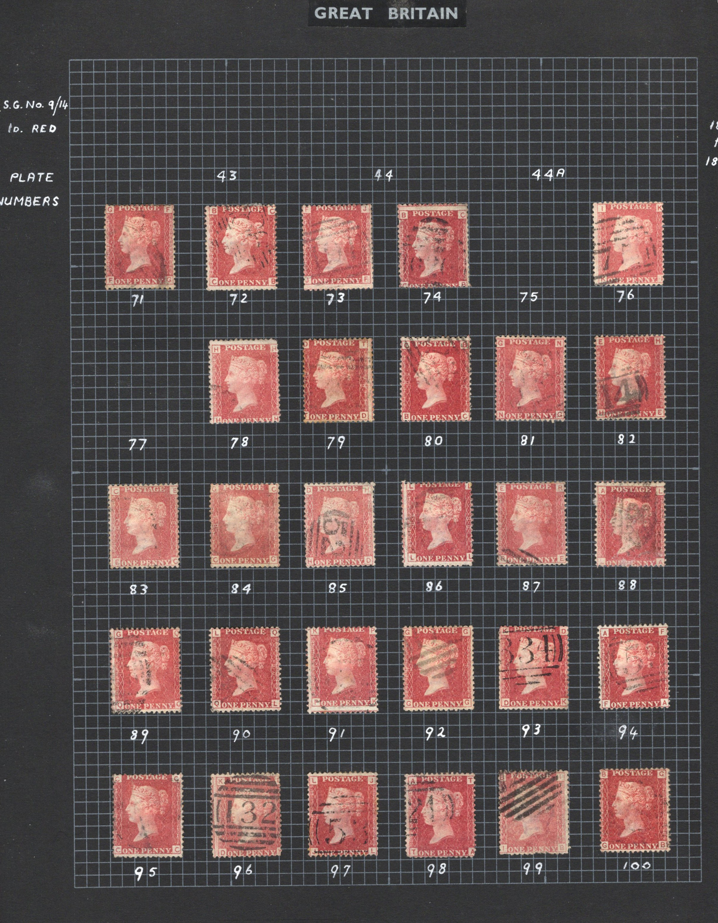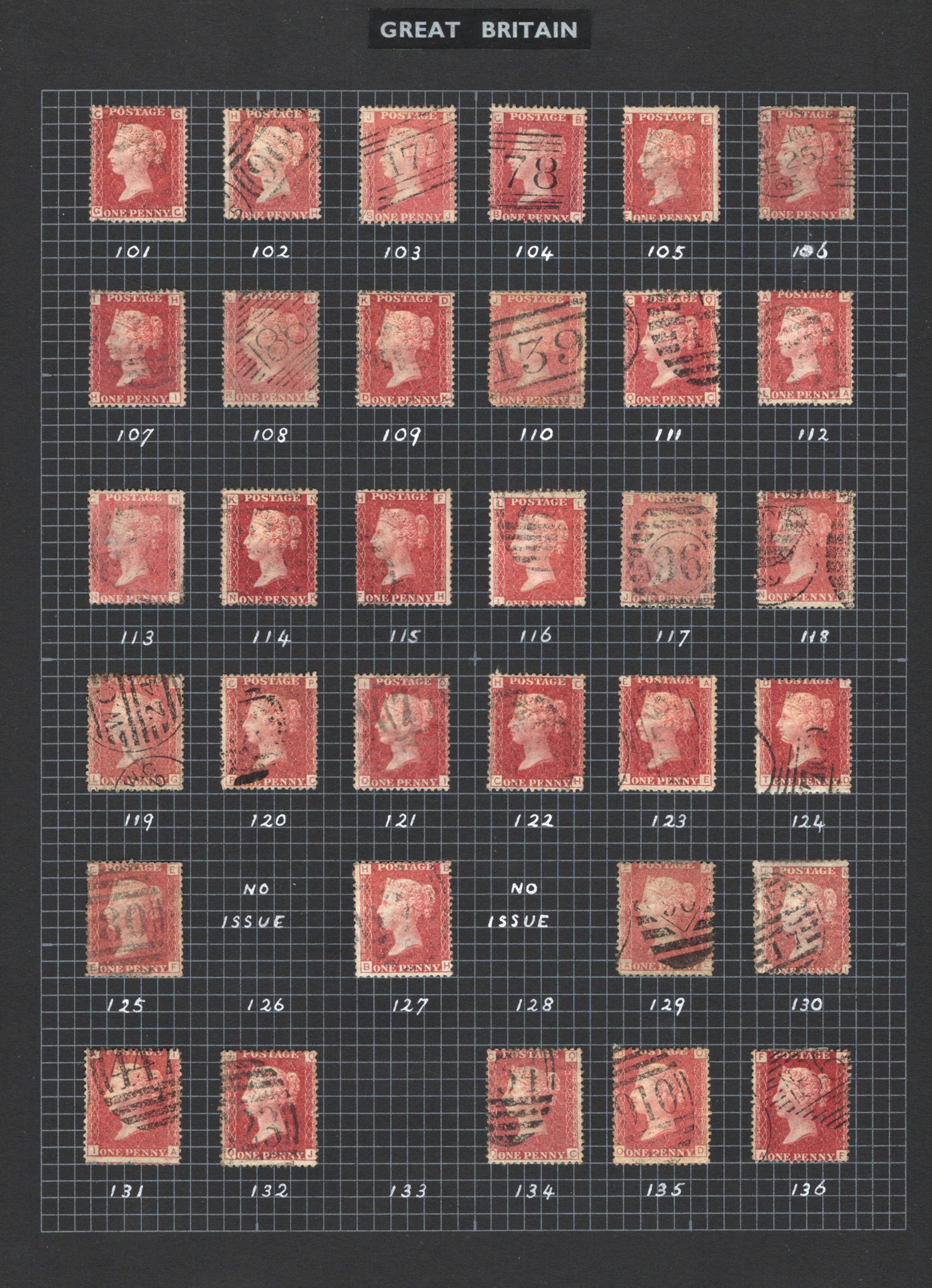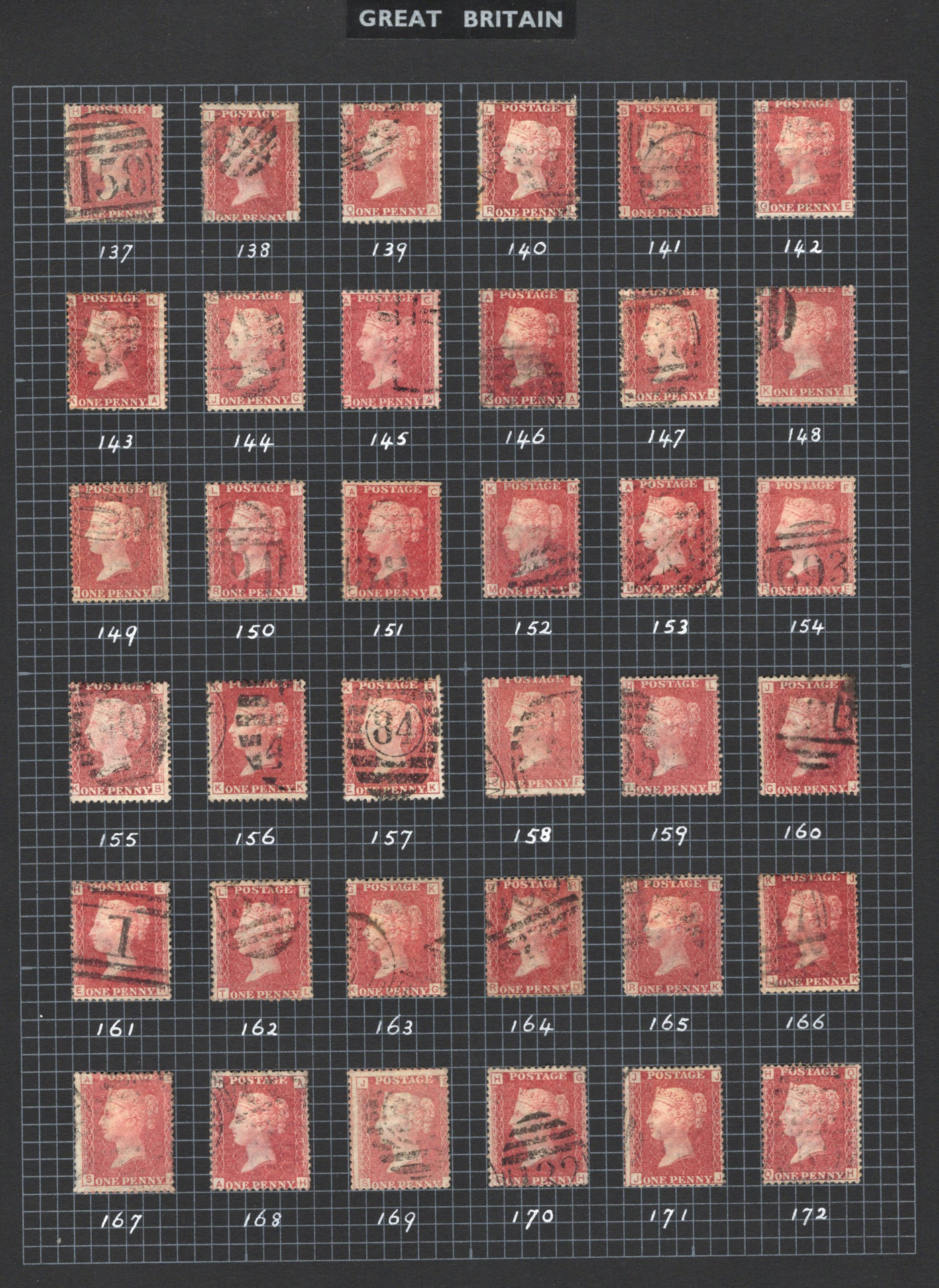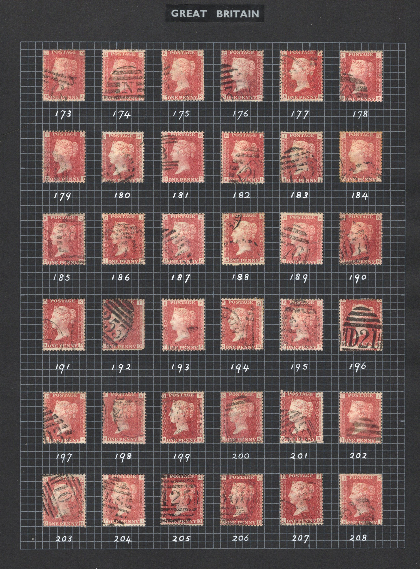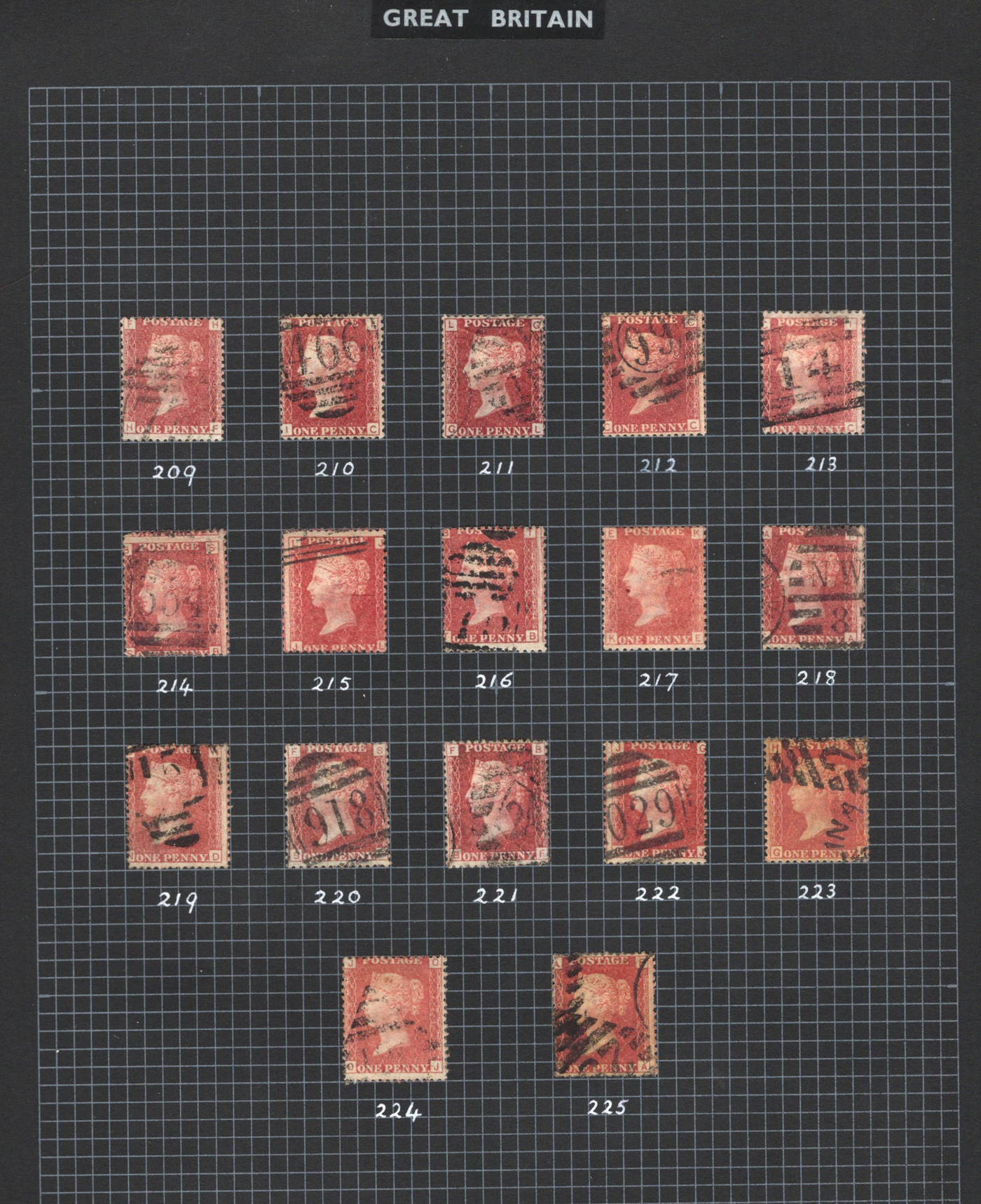 904 O 33 image1864-1879 1p Rose Red Queen Victoria Plated Collection, all neatly mounted on 5 black quadrille pages, with all plate numbers present (incl. all the key high numbers, such as 225), missing only 4 low numbers. It is immediately apparent that the owner carefully chose each stamp for quality of stamp but also readability of plate number, and the key high numbers are each quite clear. A nice and useful collection. (Scan 1) (Scan 2) (Scan 3) (Scan 4) (Scan 5) (All Scans)