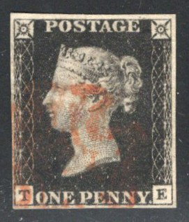 901 O 1 image1840 1p Black Queen Victoria Imperforate, used with light Maltese Cross cancel in red, from position TE, with large to clear margins, fine-very fine.