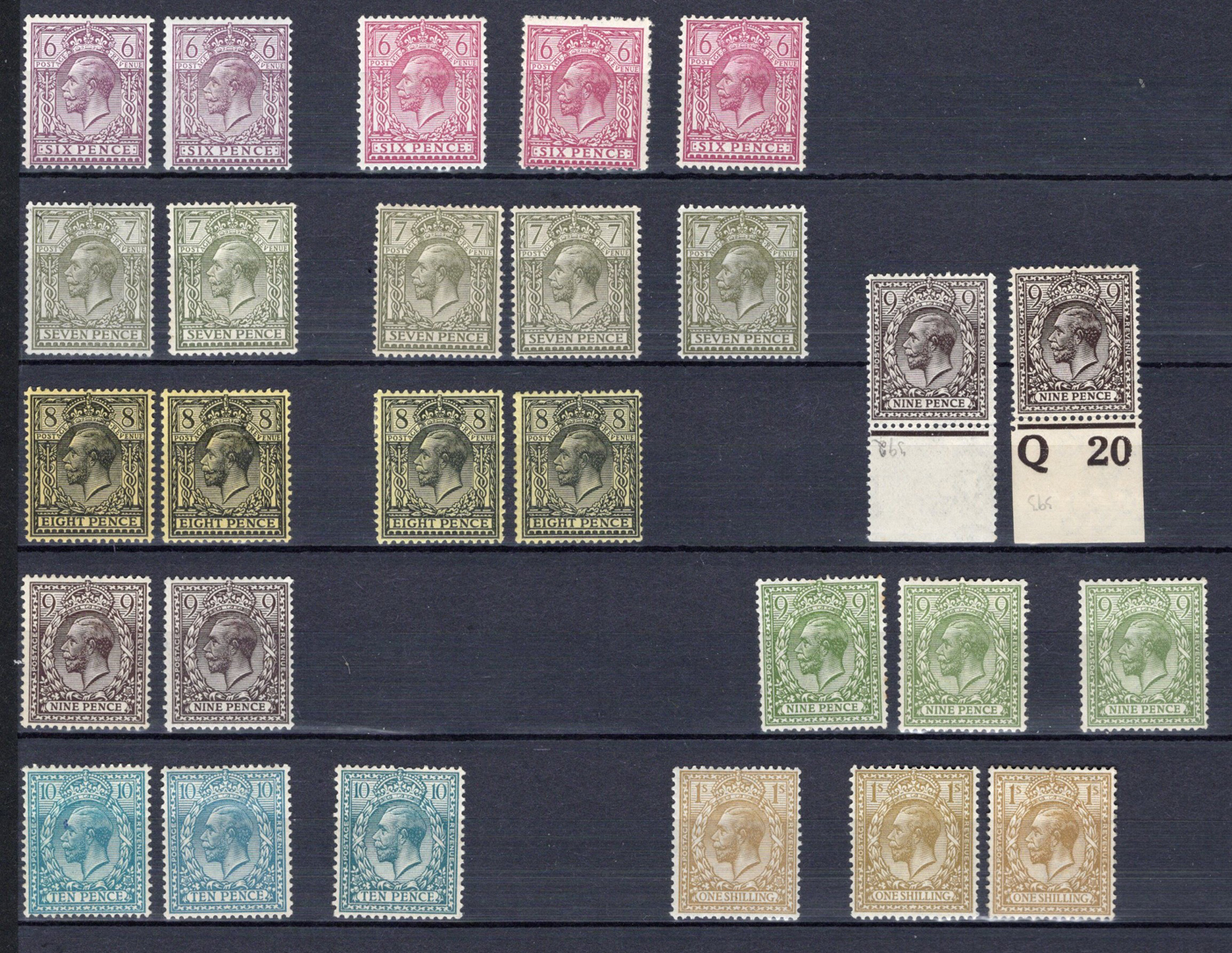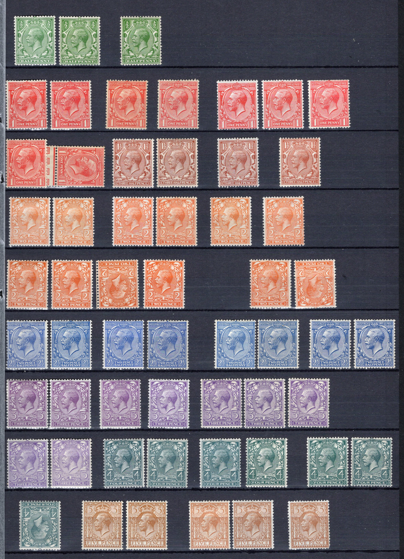 910 og/nh 159-172, 183 image1912-1922 ½p to 1sh King George V Set, two black stock sheets containing a collection of 84 mint stamps, including the second printing of the 9d. A quick look revealed some inverted or reversed watermarks, but we recommend a closer inspection, as the owner had each value separated into small groups, sometimes for shade differences, sometimes for watermarks. The catalogue value given includes premiums for never hinged stamps, but we have not counted the watermark varieties, or the different printings (Dies), so actual value will be higher, as we only used the least expensive listing for each value. Overall fine to very fine. (Scan 1) (Scan 2) (All Scans)
