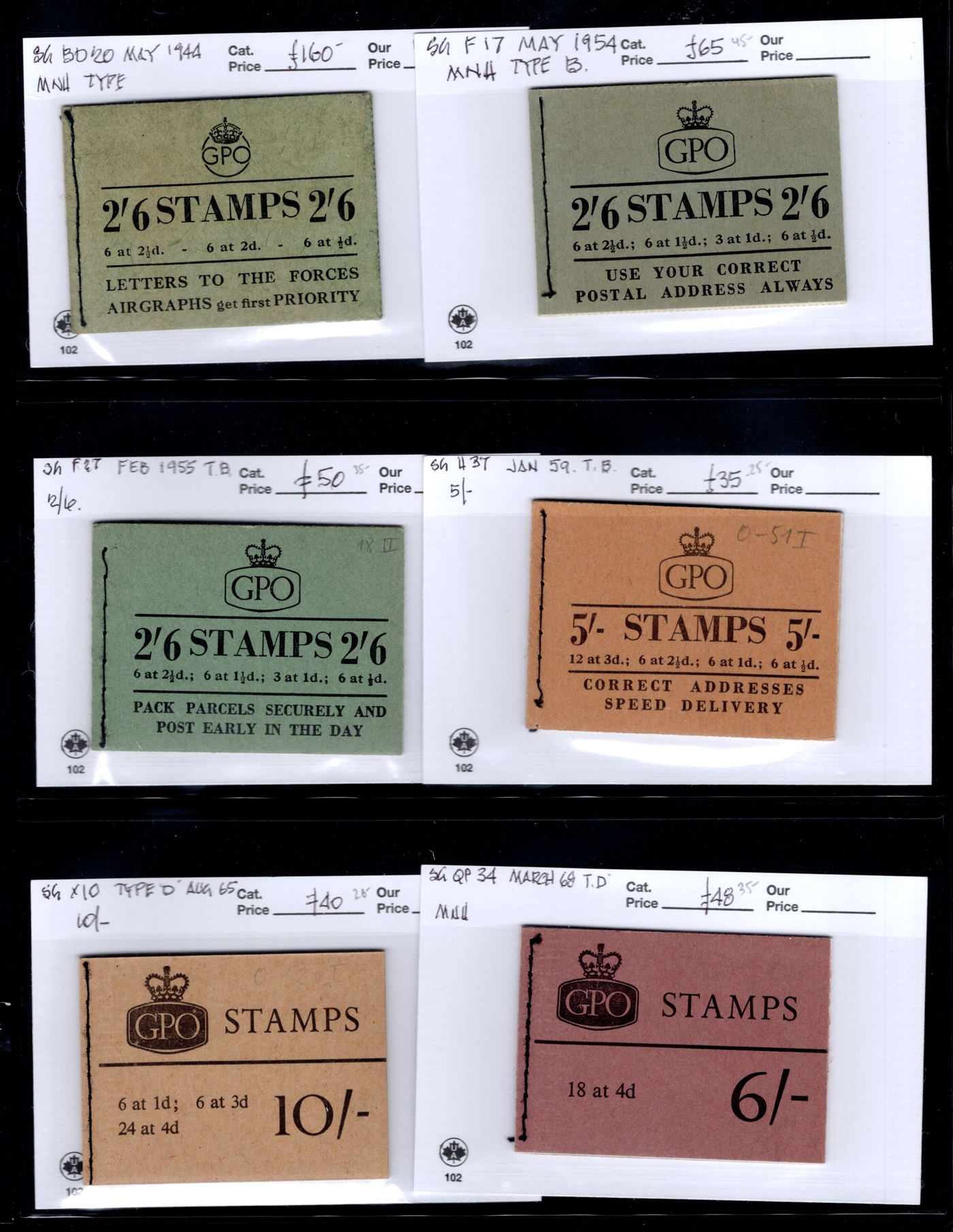 913 nh   imageGroup of Six Better Early Booklets, with Stanley Gibbons #s BD18 (May 1944), F17 (May 1954), F27 (Dec 1955), H37 (Jan 1959), X10 (Aug 1965) and QP34 (Mar 1968). Very fine.
