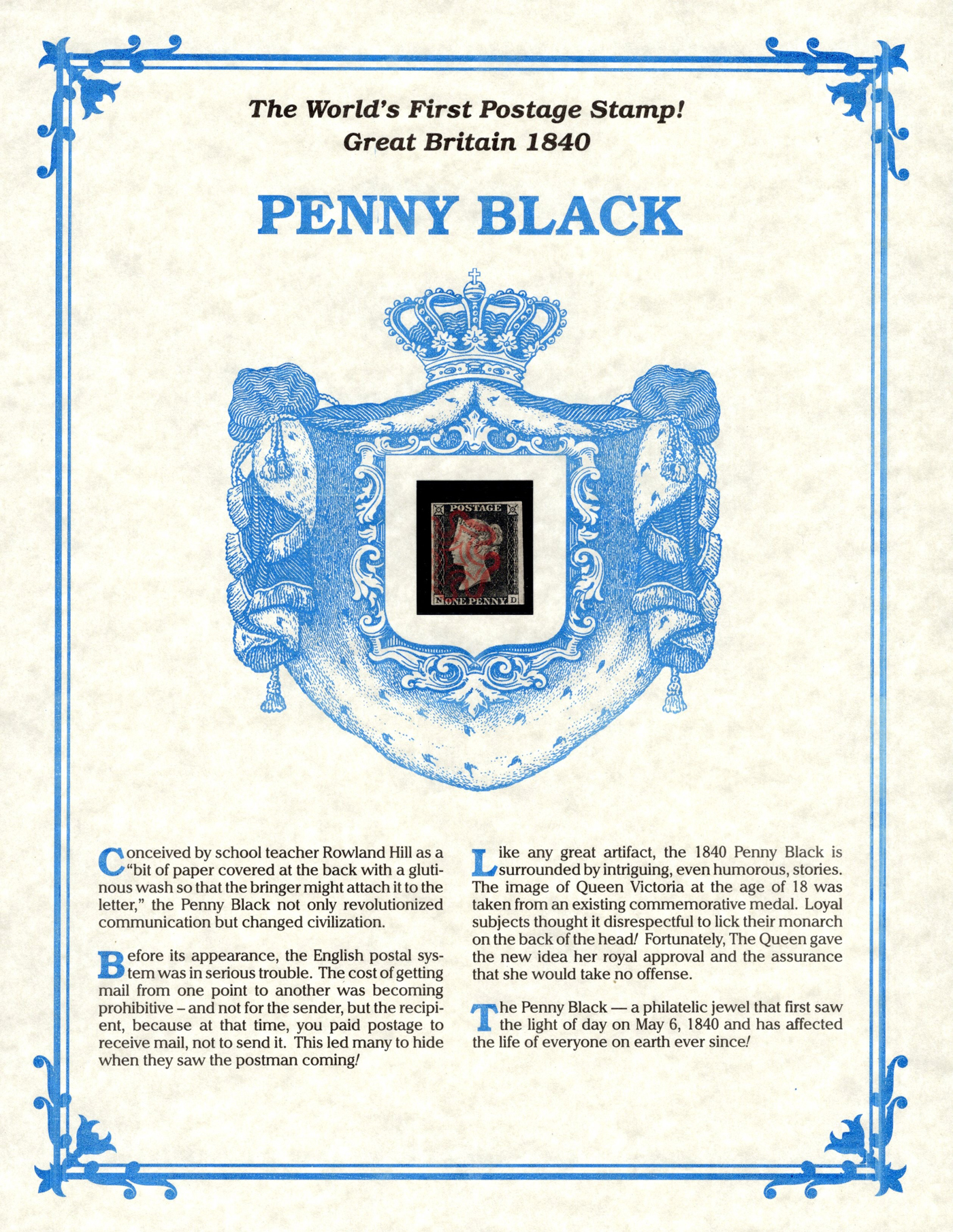902 O 1 image1840 1p Black Queen Victoria Imperforate, used with clean and crisp Maltese Cross cancel in red, from position ND, three well clear to large margins, just in at bottom, fine. Comes in a "World's First Postage Stamp" fancy presentation folder.