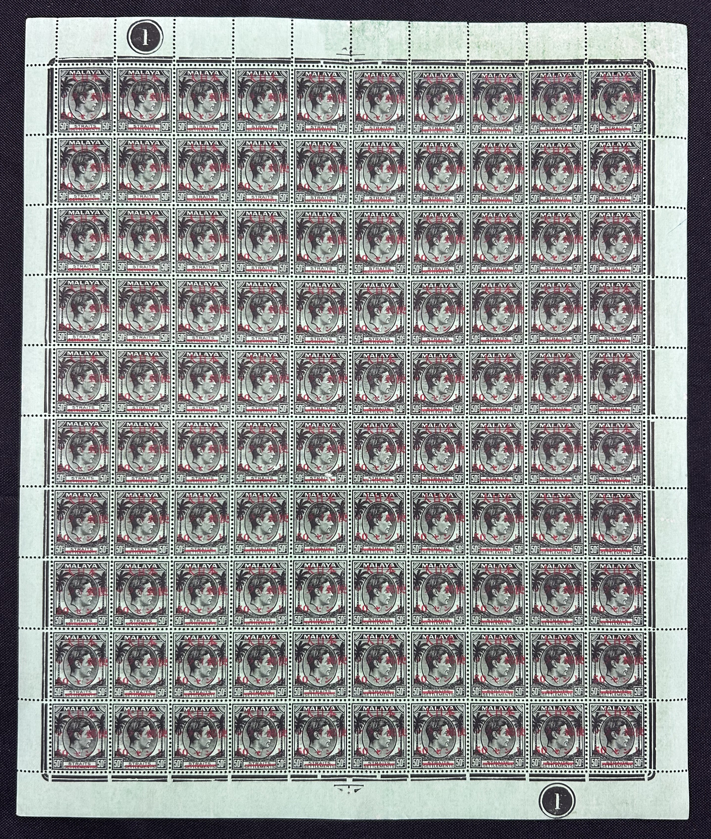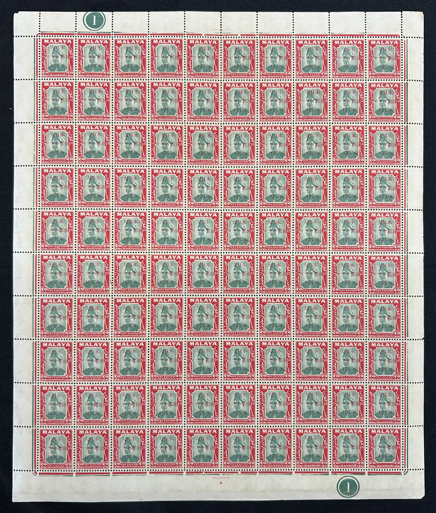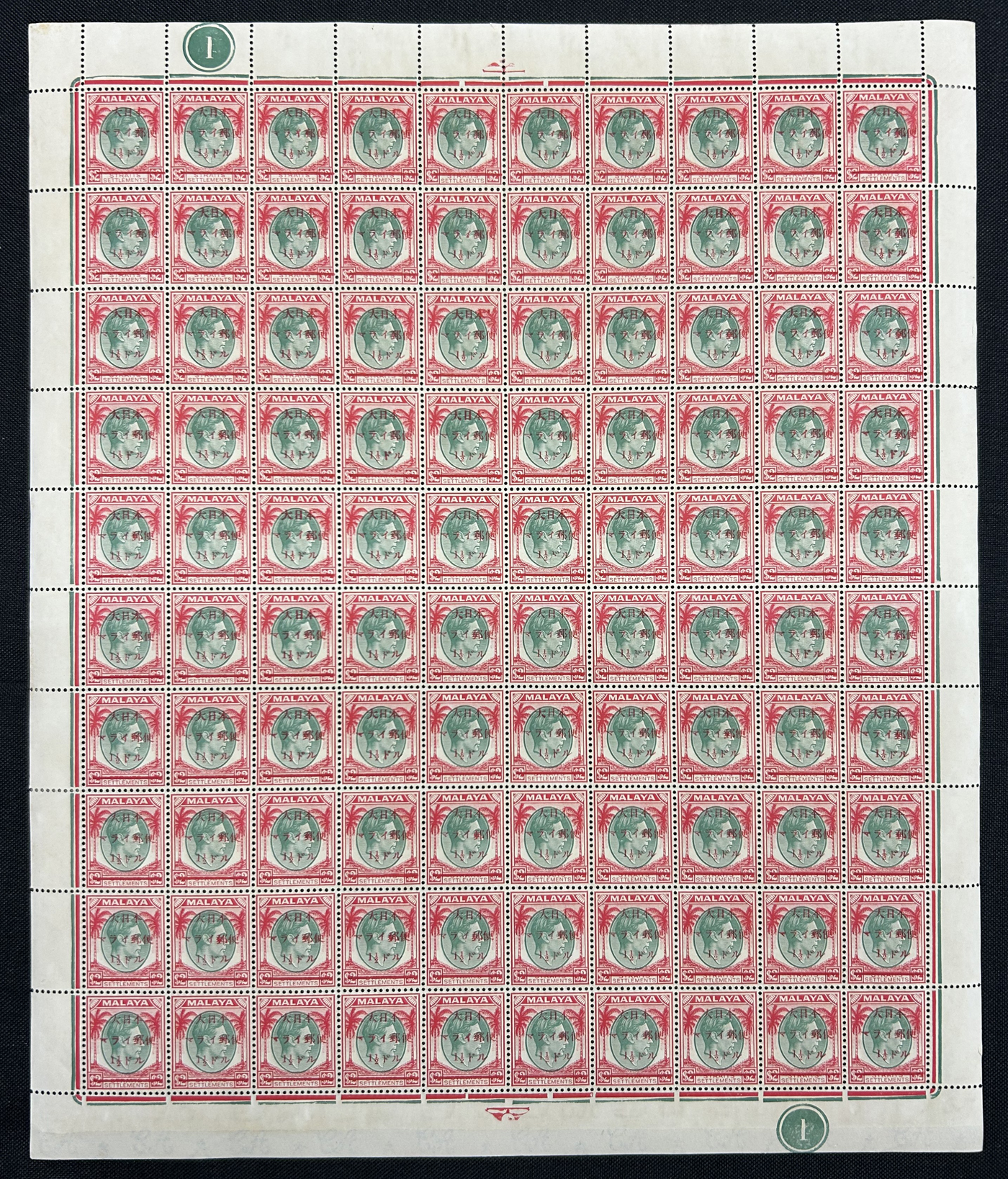 968 nh J311-J317 (S.G.) image1944 Japanese Occupation of Malaysia Overprinted Set, with all 7 values, each in a complete sheet of 100, includes overprints on Straits Settlements issues (x3), Johore (x2) and Selangor (x2). These were intended to be used on Red Cross mail and were issued in Singapore, but withdrawn one day after their issue. Couple of minor perf separations in the margins, still a fresh and very fine set. A lovely complete set of sheets for the specialist. (Scan 1) (Scan 2) (Scan 3) (Scan 4) (Scan 5) (Scan 6) (Scan 7) (All Scans)