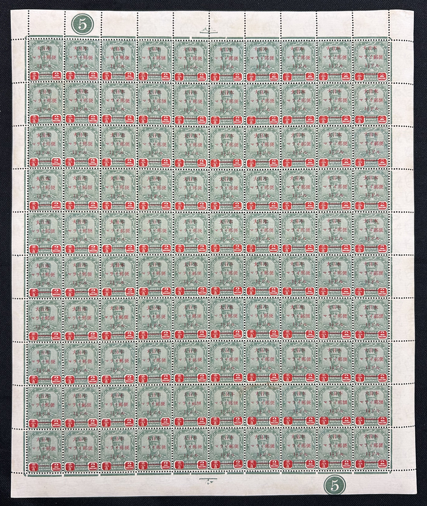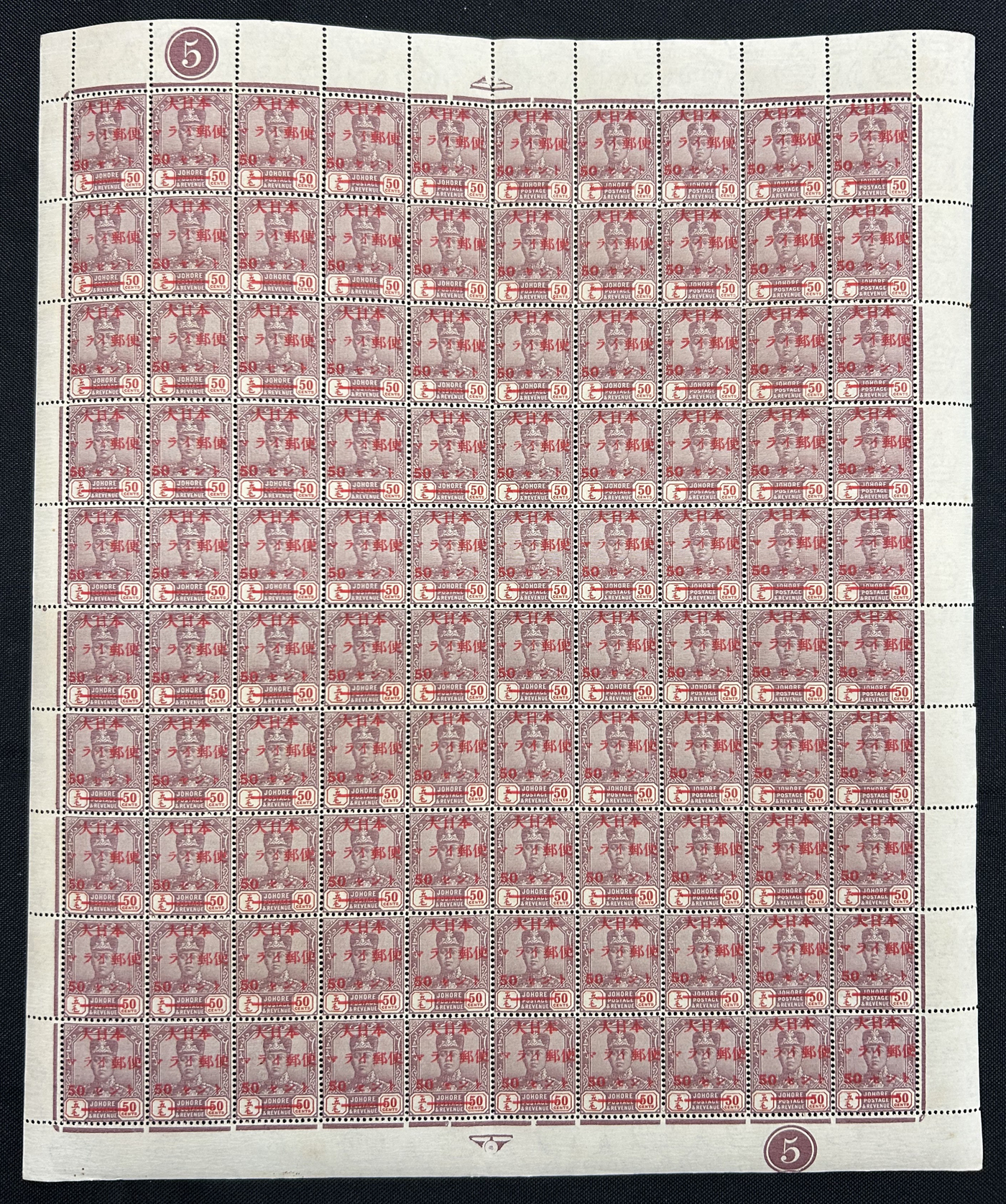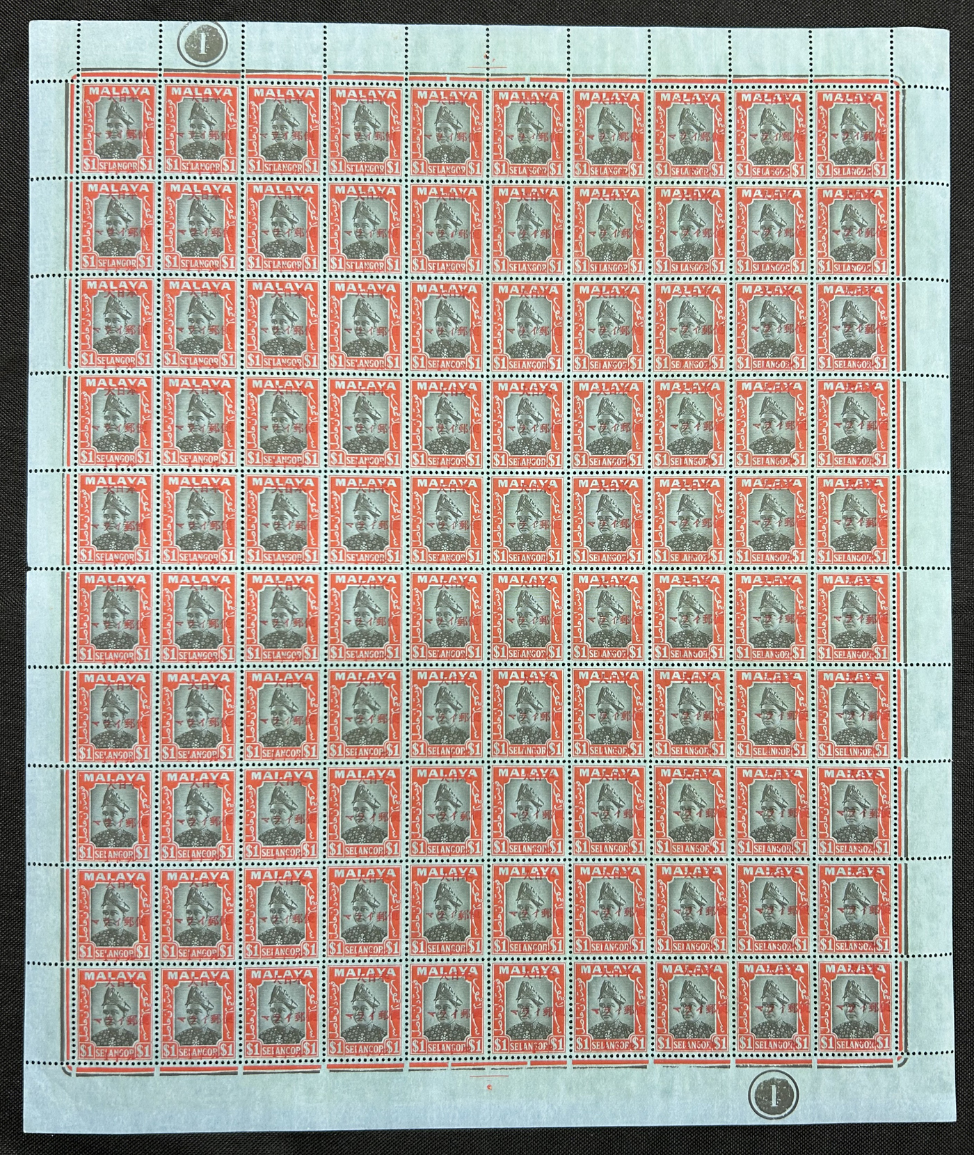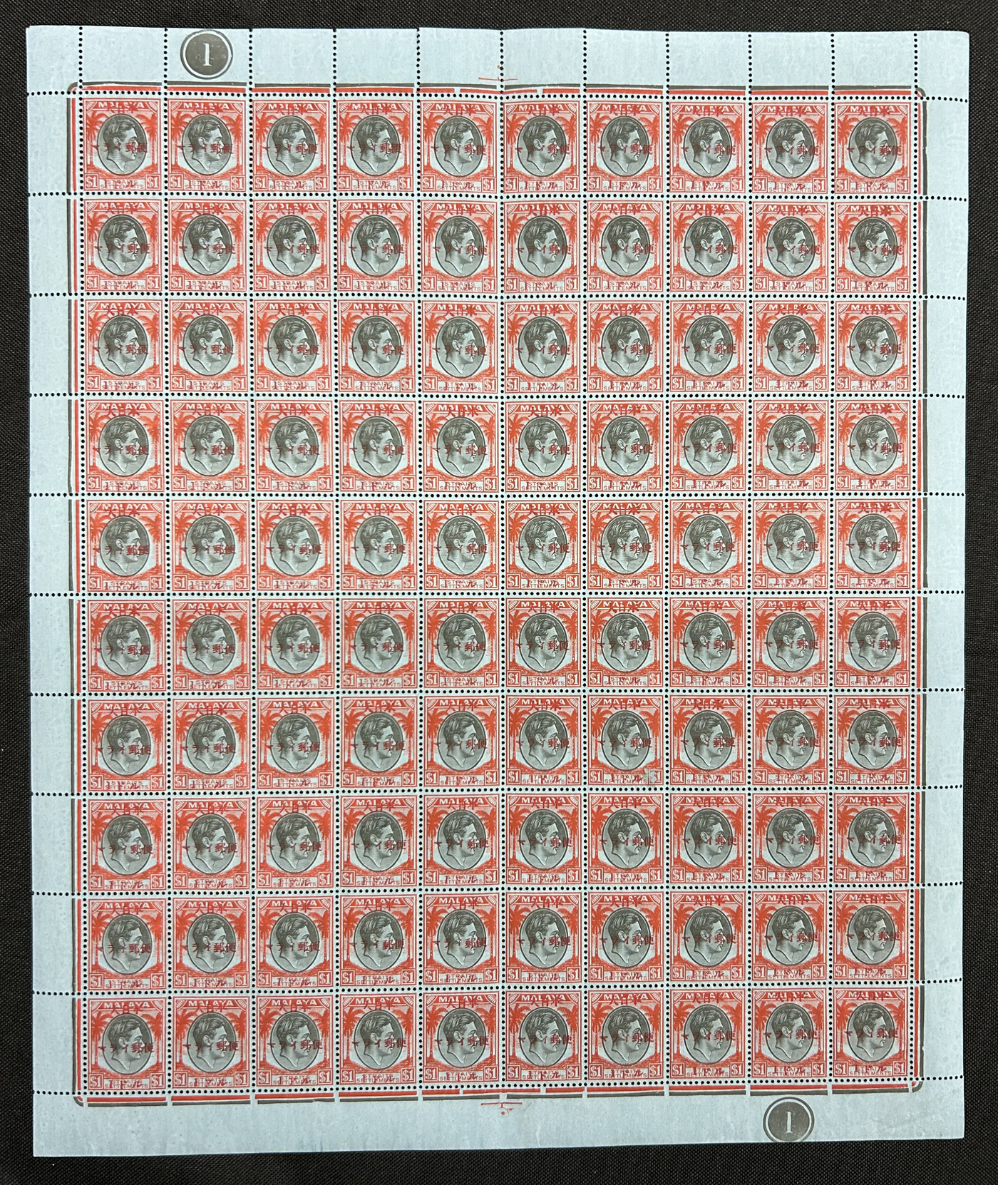 968 nh J311-J317 (S.G.) image1944 Japanese Occupation of Malaysia Overprinted Set, with all 7 values, each in a complete sheet of 100, includes overprints on Straits Settlements issues (x3), Johore (x2) and Selangor (x2). These were intended to be used on Red Cross mail and were issued in Singapore, but withdrawn one day after their issue. Couple of minor perf separations in the margins, still a fresh and very fine set. A lovely complete set of sheets for the specialist. (Scan 1) (Scan 2) (Scan 3) (Scan 4) (Scan 5) (Scan 6) (Scan 7) (All Scans)