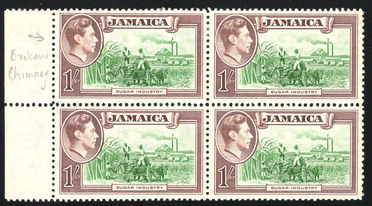 966 og/nh 130a (SG) image1938 1sh King George VI Pictorial, with "Repaired Chimney" Variety, a mint, left sheet margin block of four, with the variety visible on the upper left stamp (position R. 11/1). Top stamps very lightly hinged, bottom stamps never hinged, very fine and scarce. (Scan 1) (Scan 2) (All Scans)