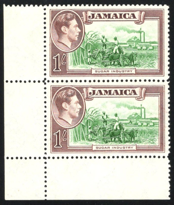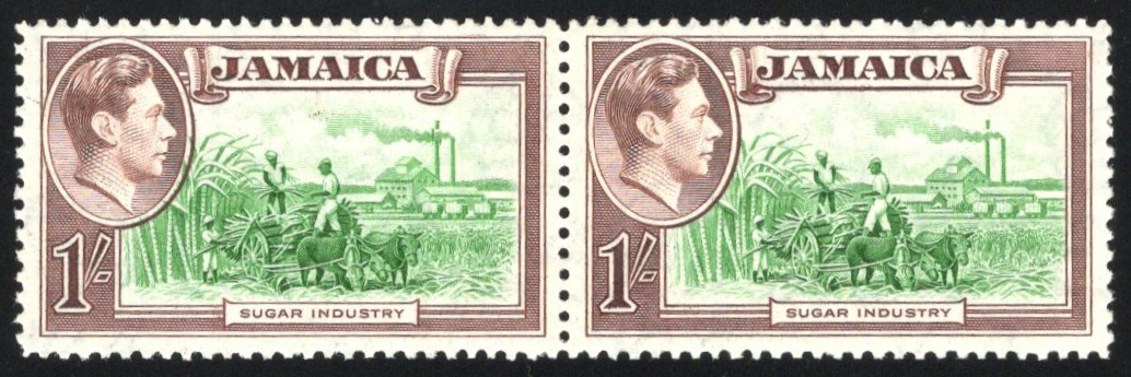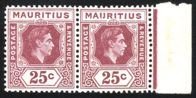 975 og 259b/ba (SG) image1941 25c Brown-Purple King George VI, with "IJ" Variety, a mint lightly hinged horizontal pair, with sheet margin at right, clearly showing the variety on the right stamp (position R. 3/6), very fine and seldom offered. (Scan 1) (Scan 2) (All Scans)