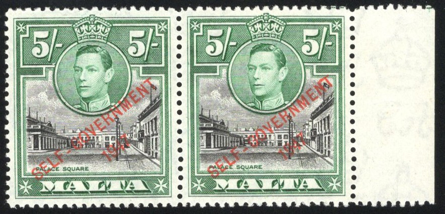 971 og/nh 247/a (SG) image1948 5sh King George VI Self Government, with "N and T Joined" Variety, a mint right-margined horizontal pair, clearly showing the variety from position R. 4/10 on the right stamp. The left stamp is never hinged and the right stamp is very lightly hinged, very fine.