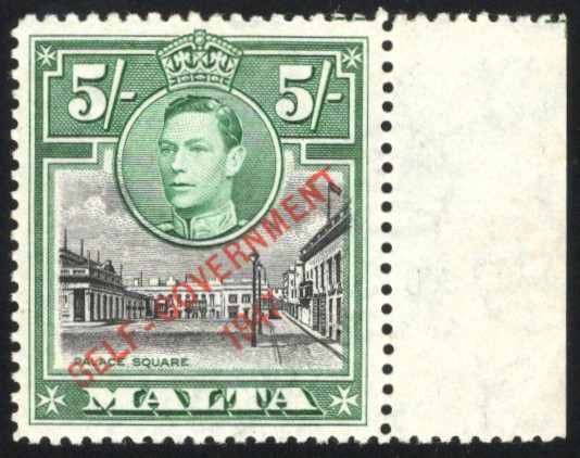 973 og 247a (SG) image1948 5sh King George VI Self Government, with "N and T Joined" Variety, mint lightly hinged with sheet margin at right, clearly showing the variety from position R. 4/10, very fine.
