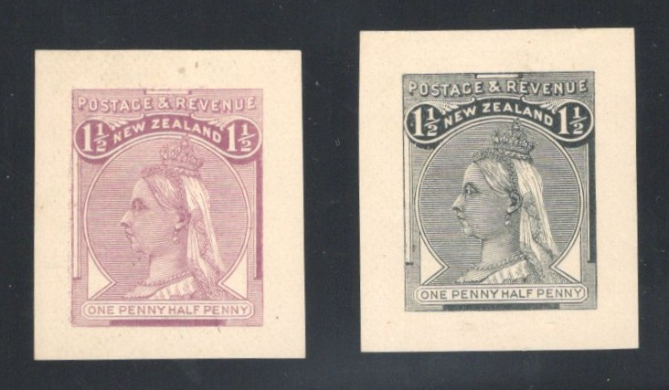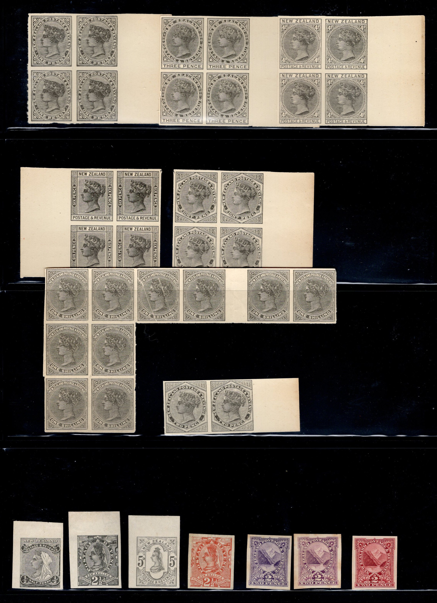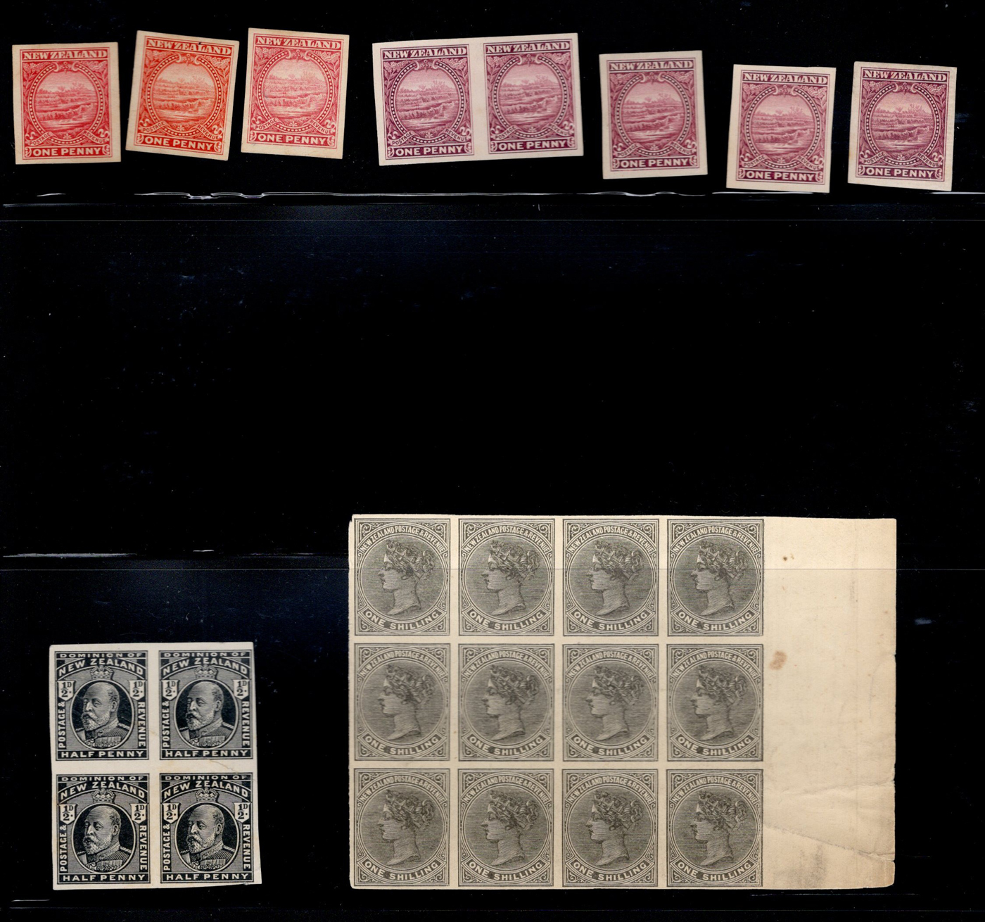 977 E/P   imageAssortment of Various Plate and Colour Proofs From the Queen Victoria Era (and one King Edward VII), includes the 1882 “Second Sideface” issue in multiples of 2 to 10 of a type, plus a bonus block of 12 of the 1sh, all in black on unwatermarked stamp paper. The 1891-5 trio includes a black-ink upper right plate proof on unwatermarked stamp paper, plus a colour trial in an unused reddish colour for the 2½d. There is a trio of the 2d “Pembroke” and the 1d “White Terrace” (in various colours - note that we are unsure if a couple might be cut squares from stationery). The ½d KEVII is in black on unwatermarked stamp paper (horizontal crease). (Scan 1) (Scan 2) (All Scans)
