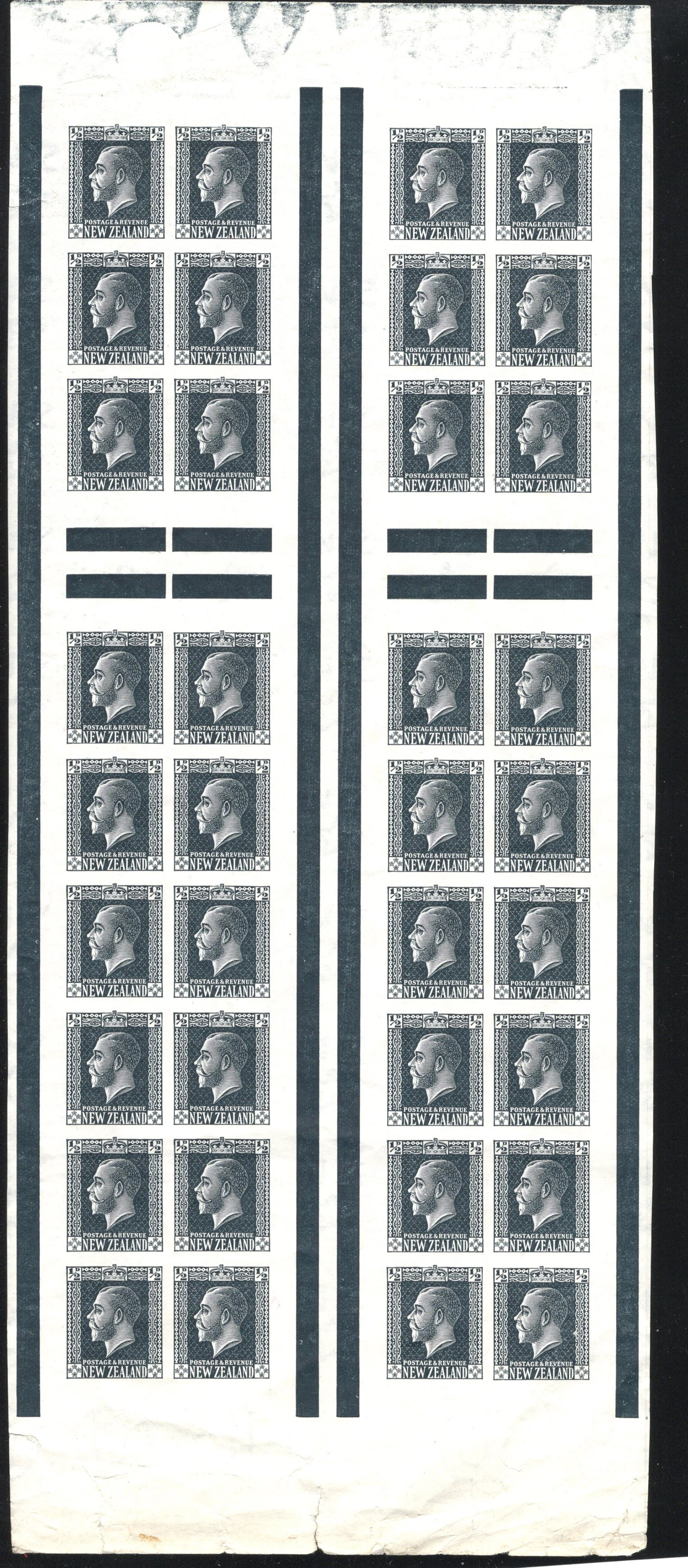 979 E/P 144b image1915 ½d King George V Plate Proof of Six Complete Booklet Panes, in black, with single side bars and either a dividing bar at bottom, top or not at all. Printed on gummed, watermarked stamp paper, showing large parts of the “New Zealand Post” watermark in the margins. A bit of edge damage, including a couple of creases and minor tears, probably due to its large size. A scarce item for the specialist.