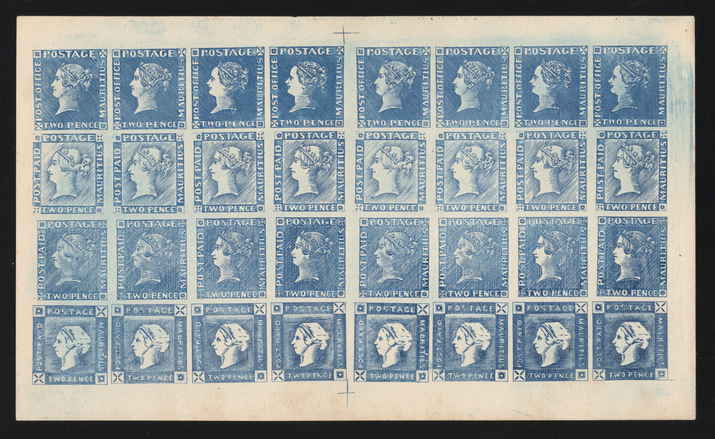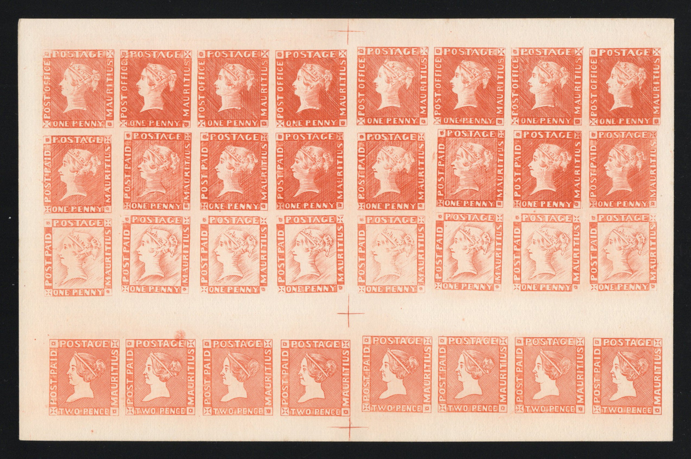 974   image1847-1859 Queen Victoria Composite Engraved Forgery Sheets, with two sheets of 32 stamps each, one in red (1d and 2d values) and one in blue (2d values) with a variety of designs (8 stamps of each design). Each stamp has a "Privater Nachdruck" handstamp on back. large margins, very fine. (Scan 1) (Scan 2) (All Scans)