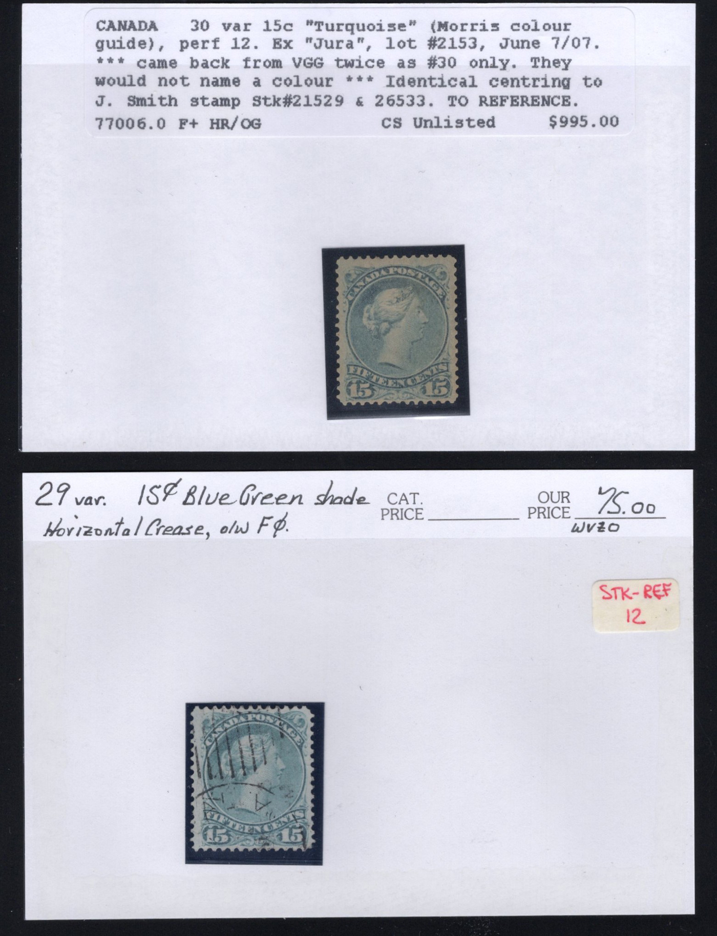 Large Queen, a useful research lot which includes two items from the John Jamieson stock: a used "blue-green" shade (crease) and a mint (hr) "turquoise" shade, perforated 12, ex "Jura" collection (priced at $995). The latter is accompanied by a