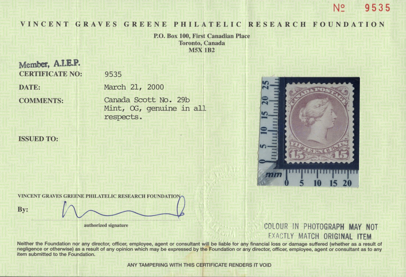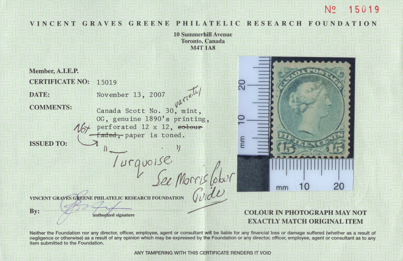 2007 Greene Foundation certificate stating that it is a "colour faded, paper is toned", with Jamieson notes explaining what he suggests the stamp is. The stamps are accompanied by several supporting items, including a copy of the Morris Colour Guide