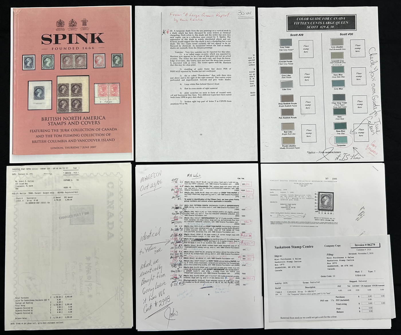 listing the shade, a photocopy from "A Large Queen Report" by Hans Reiche explaining this shade as well as other documents detailing the sale of two "identical" other stamps from the J. Smith collection (both with Greene certificates stating