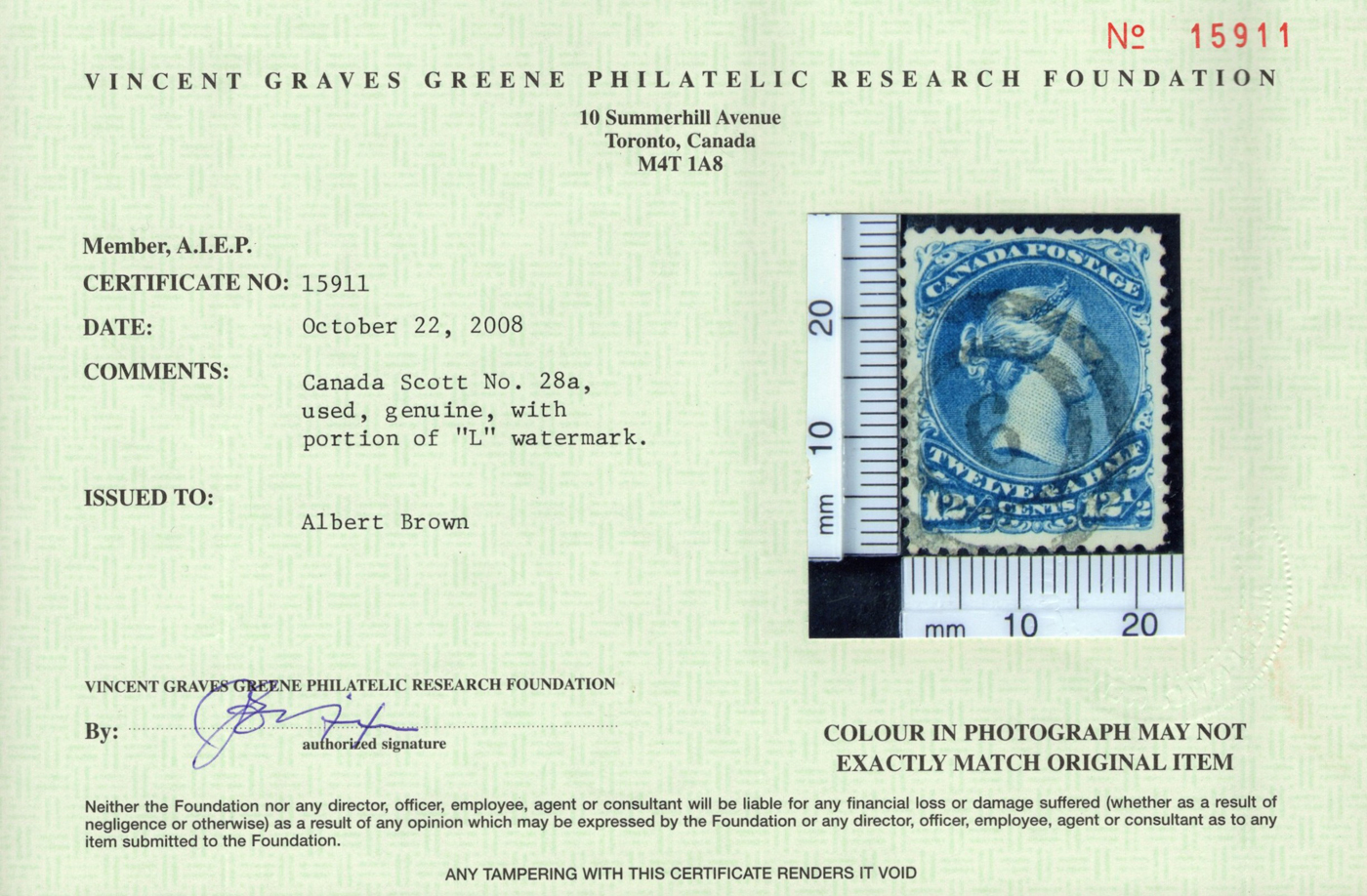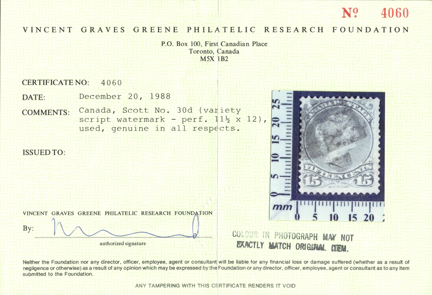 Large Queen, Perforated 11½ x 12, with Script Watermark, used with cork cancel, clearly showing a good portion the Pirie script watermark (see photo), fine and fresh. A nice example of this sought-after stamp. Accompanied by a 1988 Greene