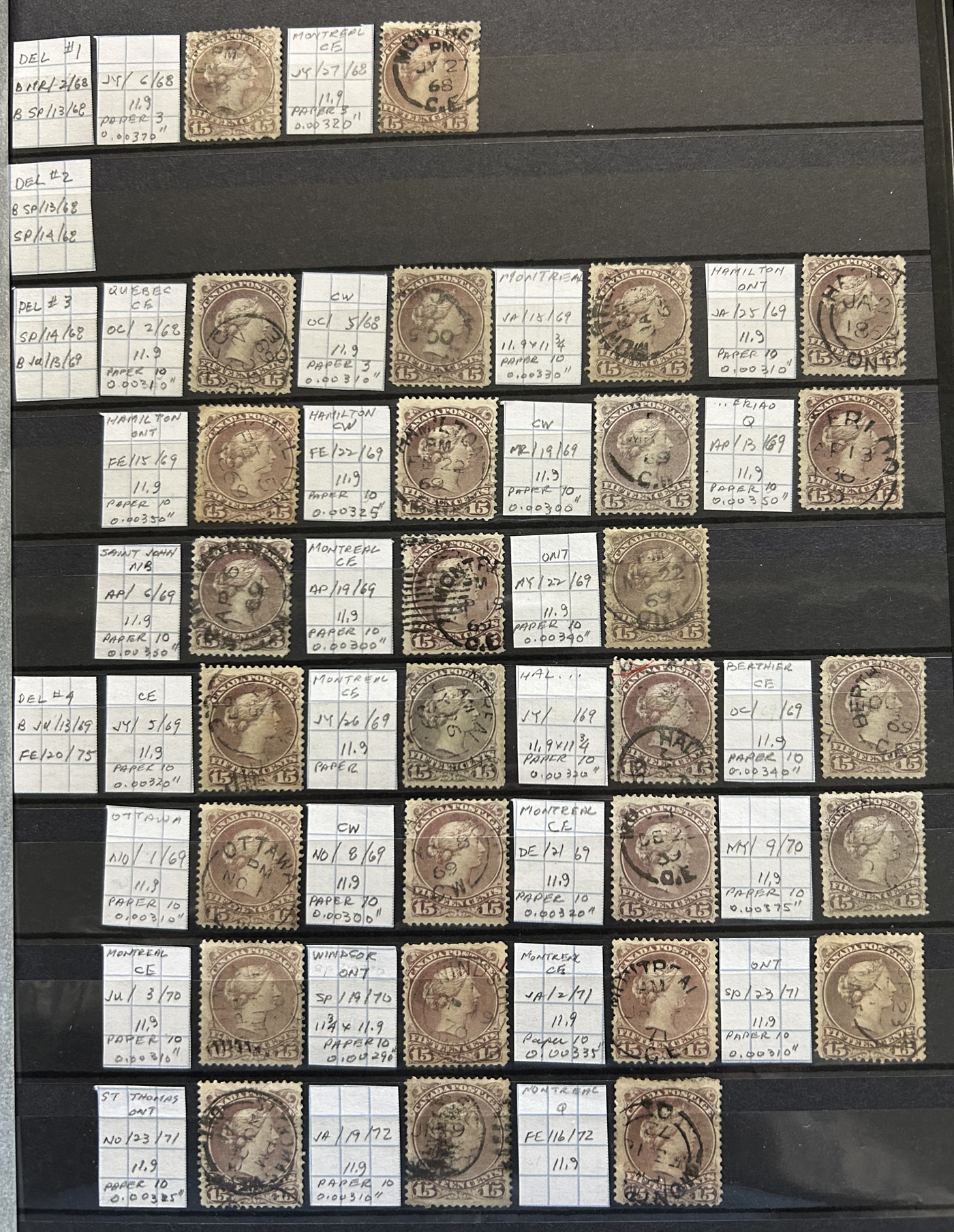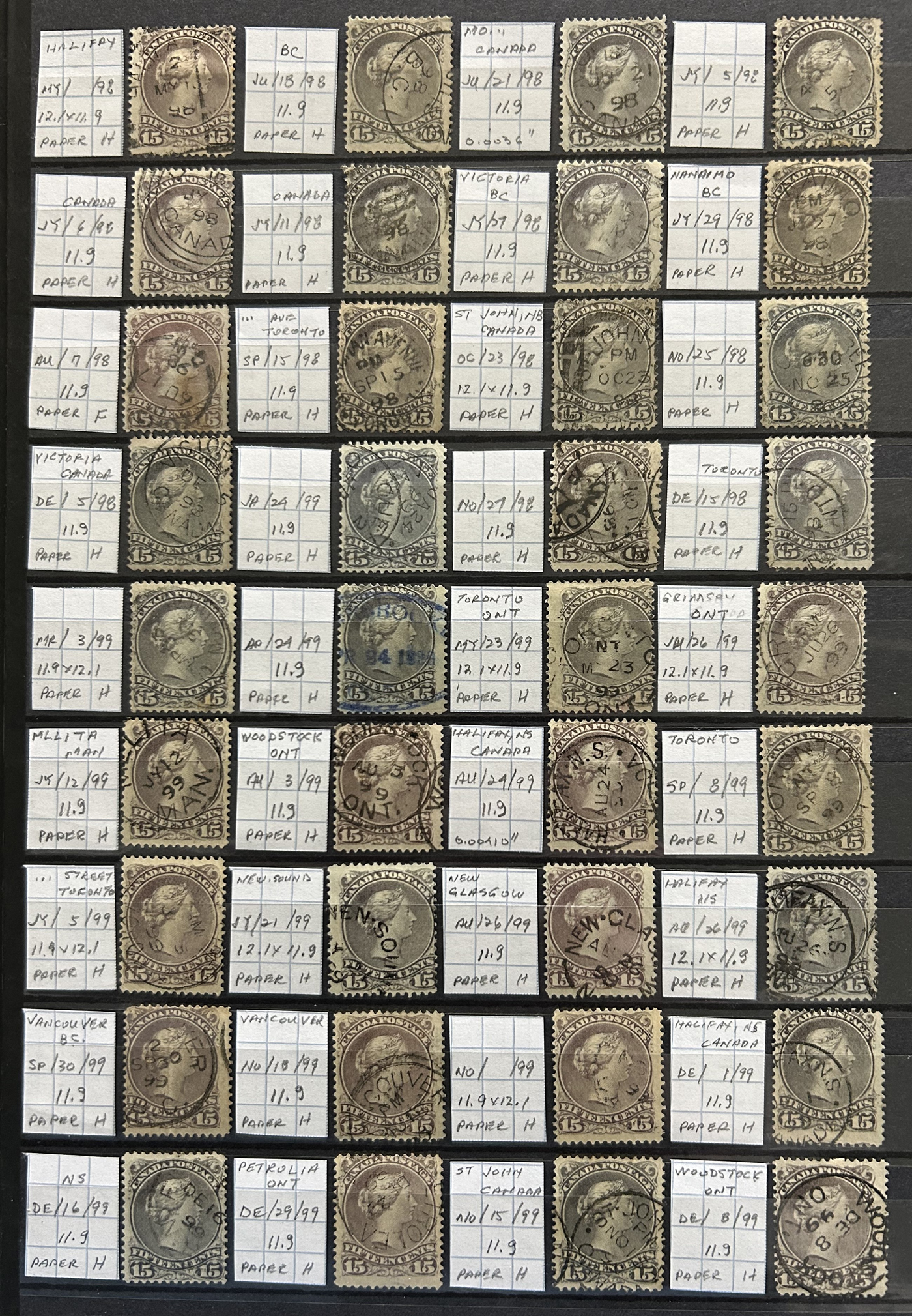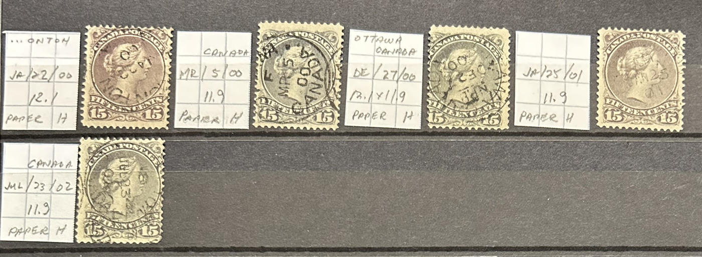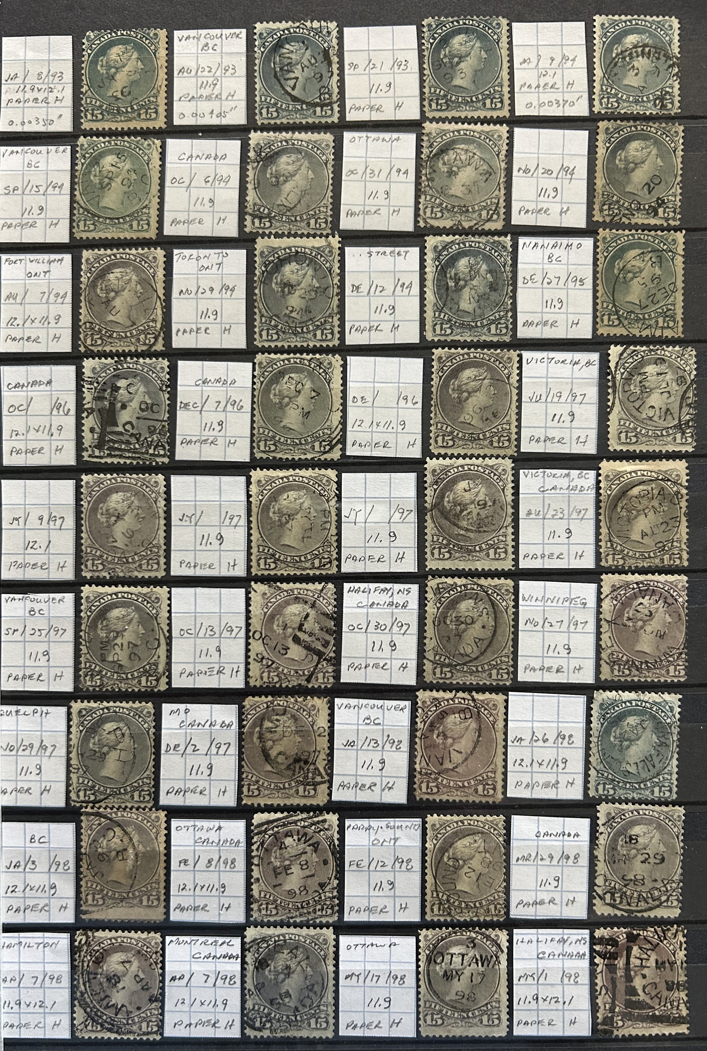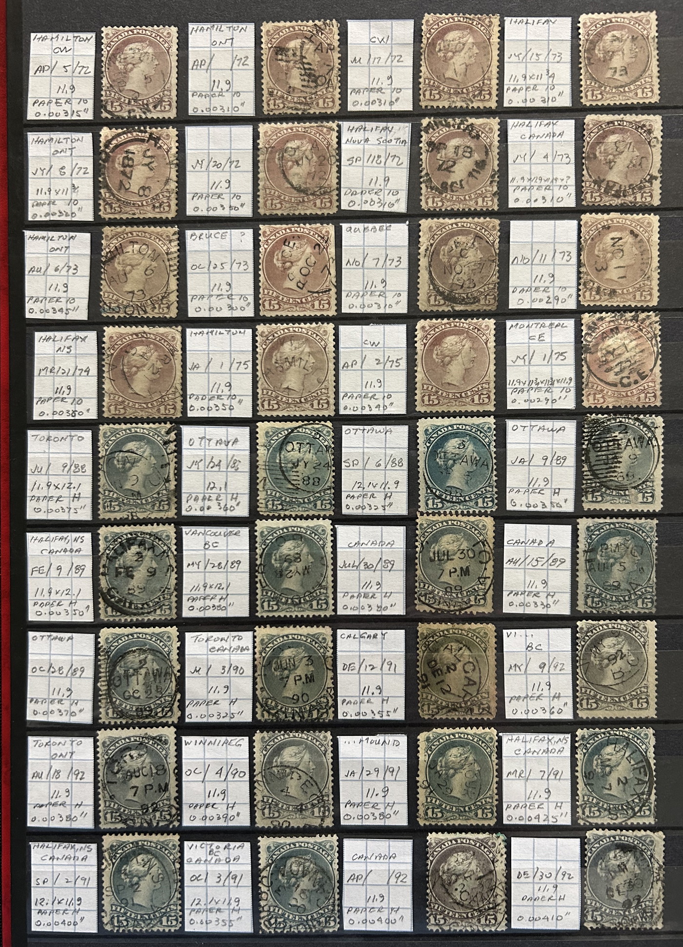 Fully Dated 15c Large Queens, with 141 stamps, all arranged chronologically in a stockbook, with each stamp identified by owner as to date, paper and perforation (also printing orders). Saw a few clipped perfs and irrelevant small faults, still