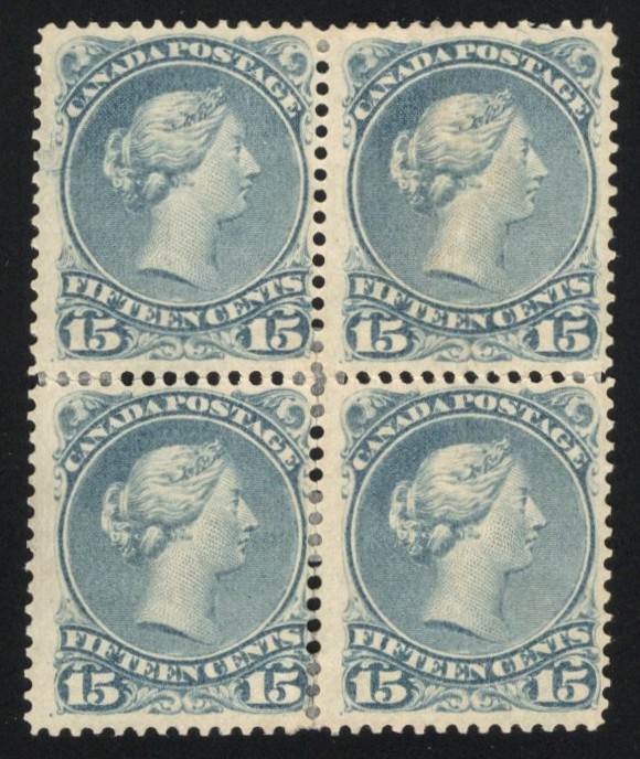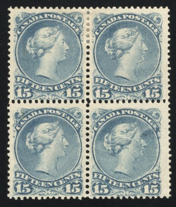 Large Queen, a mint block of four with hinged original gum, in a shade similar to deep blue (30e) but more slate in nature, with an ink blob on the lower right stamp, fine. Accompanied by a 2025 Greene Foundation certificate identifying it as a