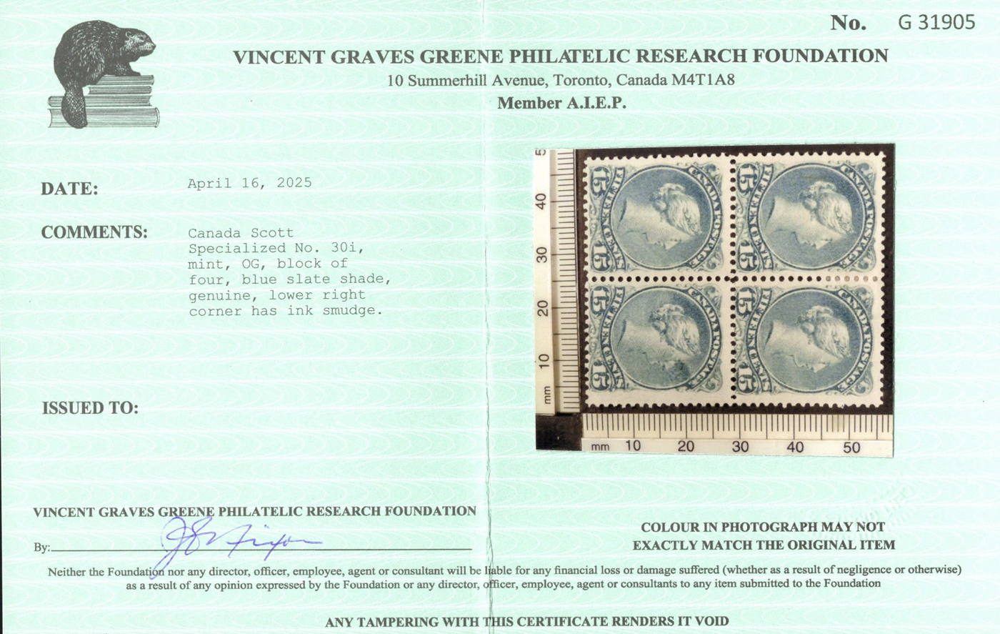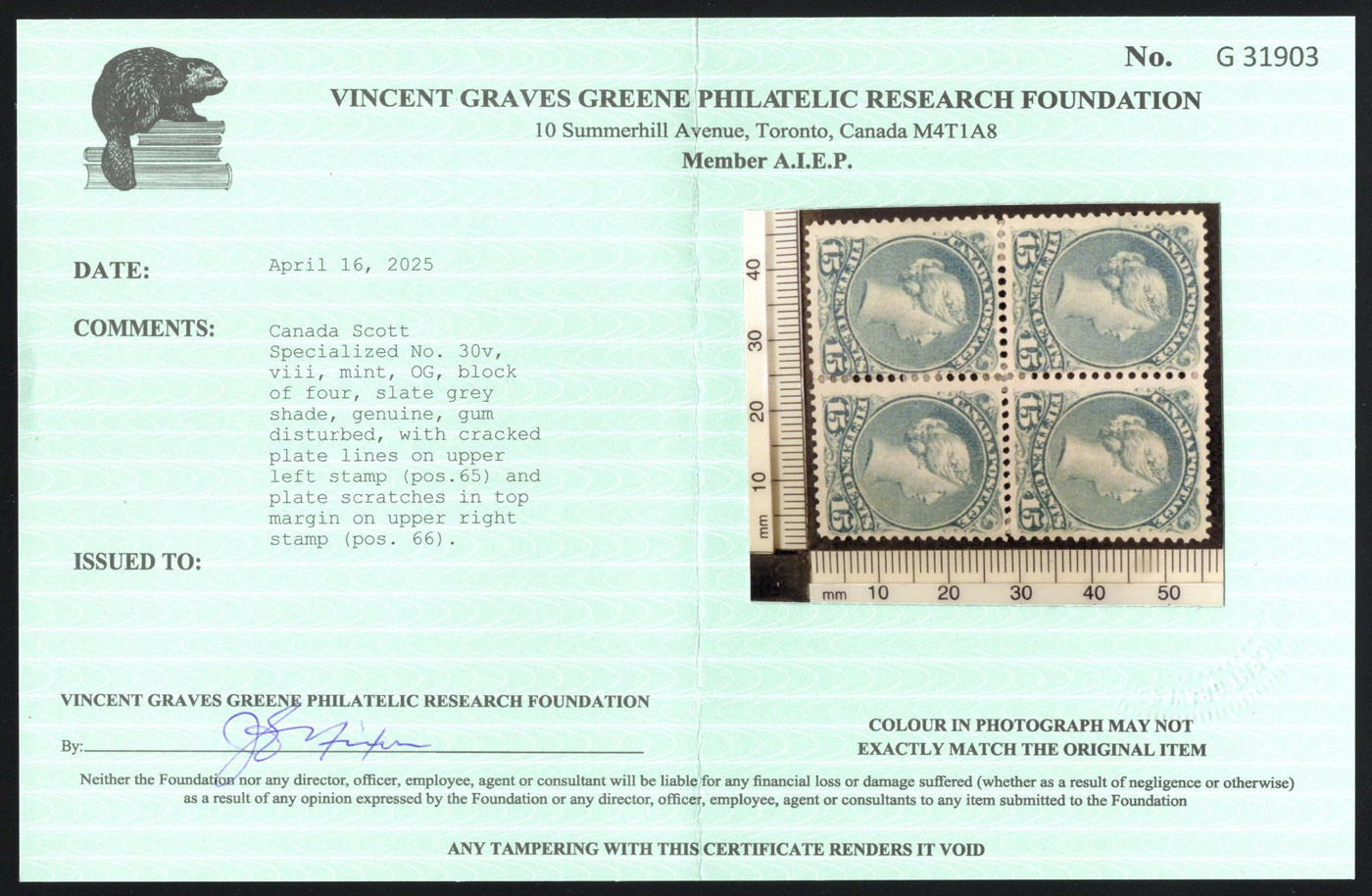 (position 66), fine, and a useful positional piece showing both varieties side by side. Accompanied by a 2025 Greene Foundation certificate. Catalogue value given is for the upper left stamp (Unitrade #30v) only. (Scan 1)