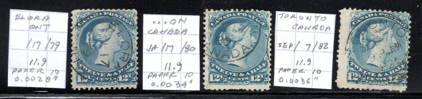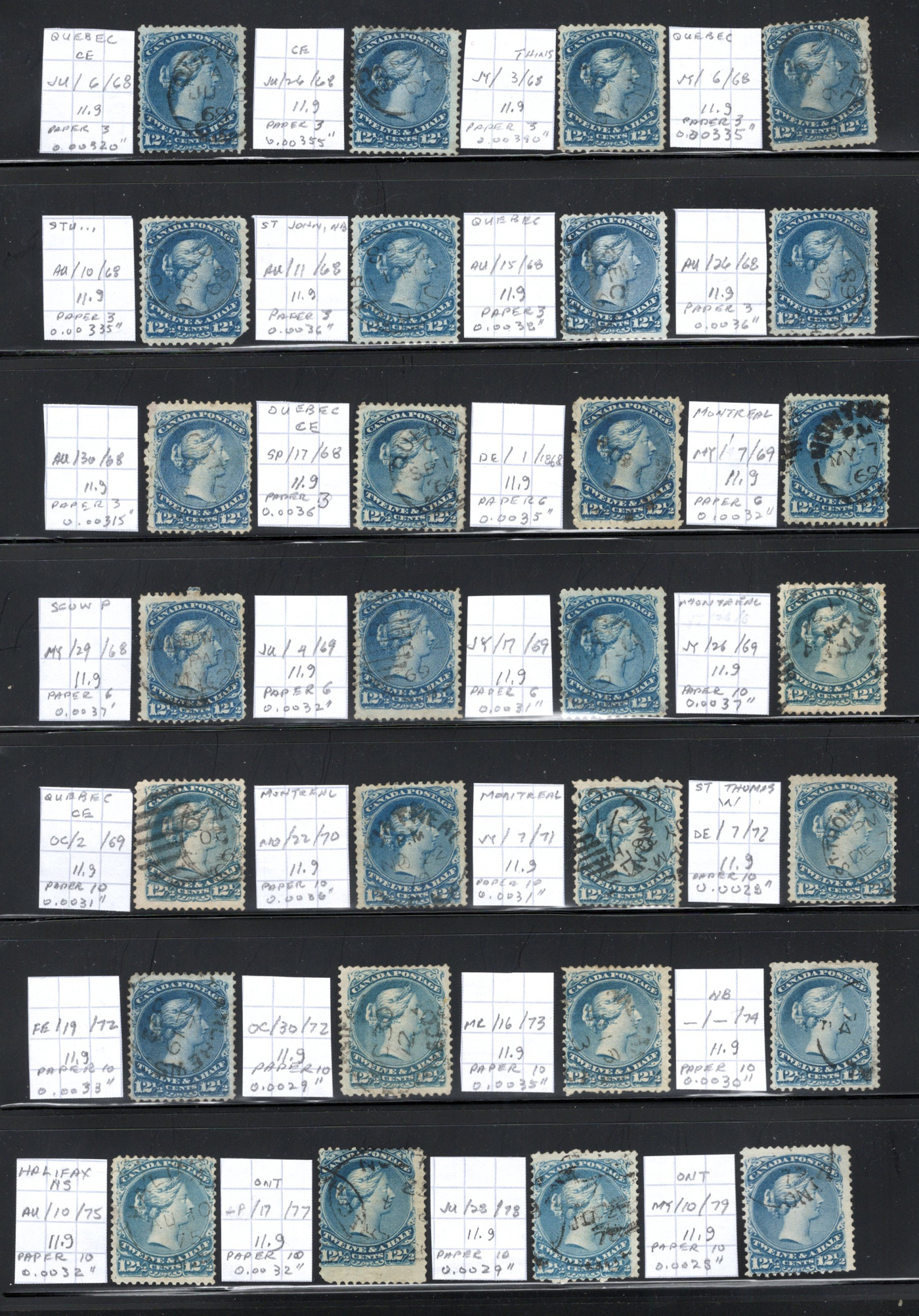 12½c Blue Large Queens, with 31 stamps, all arranged chronologically on a 2-sided stock page, with each stamp identified by owner as to date (June 1868 to Sept 1882), perforation, paper and paper thickness. The great majority are fully dated,