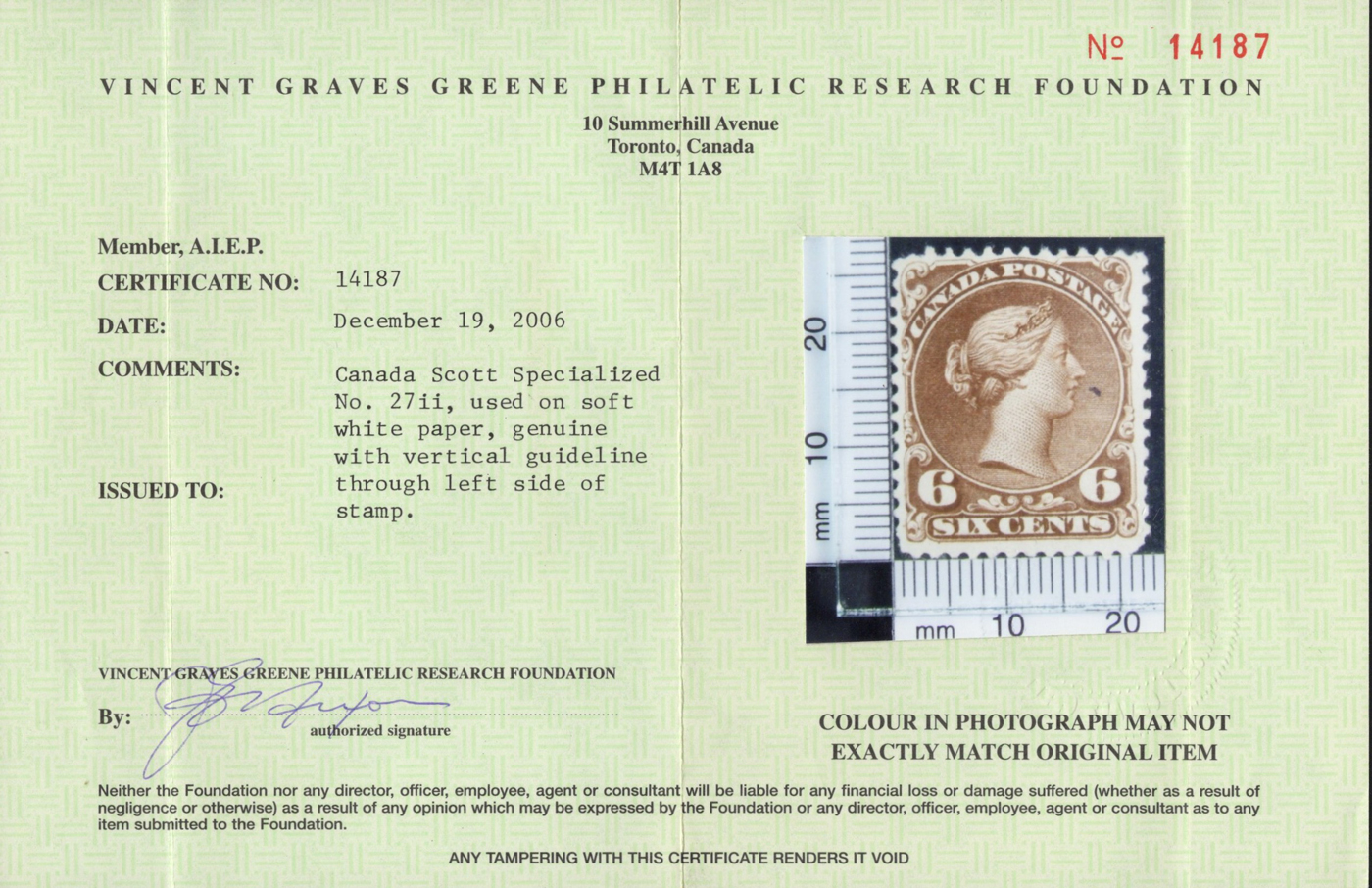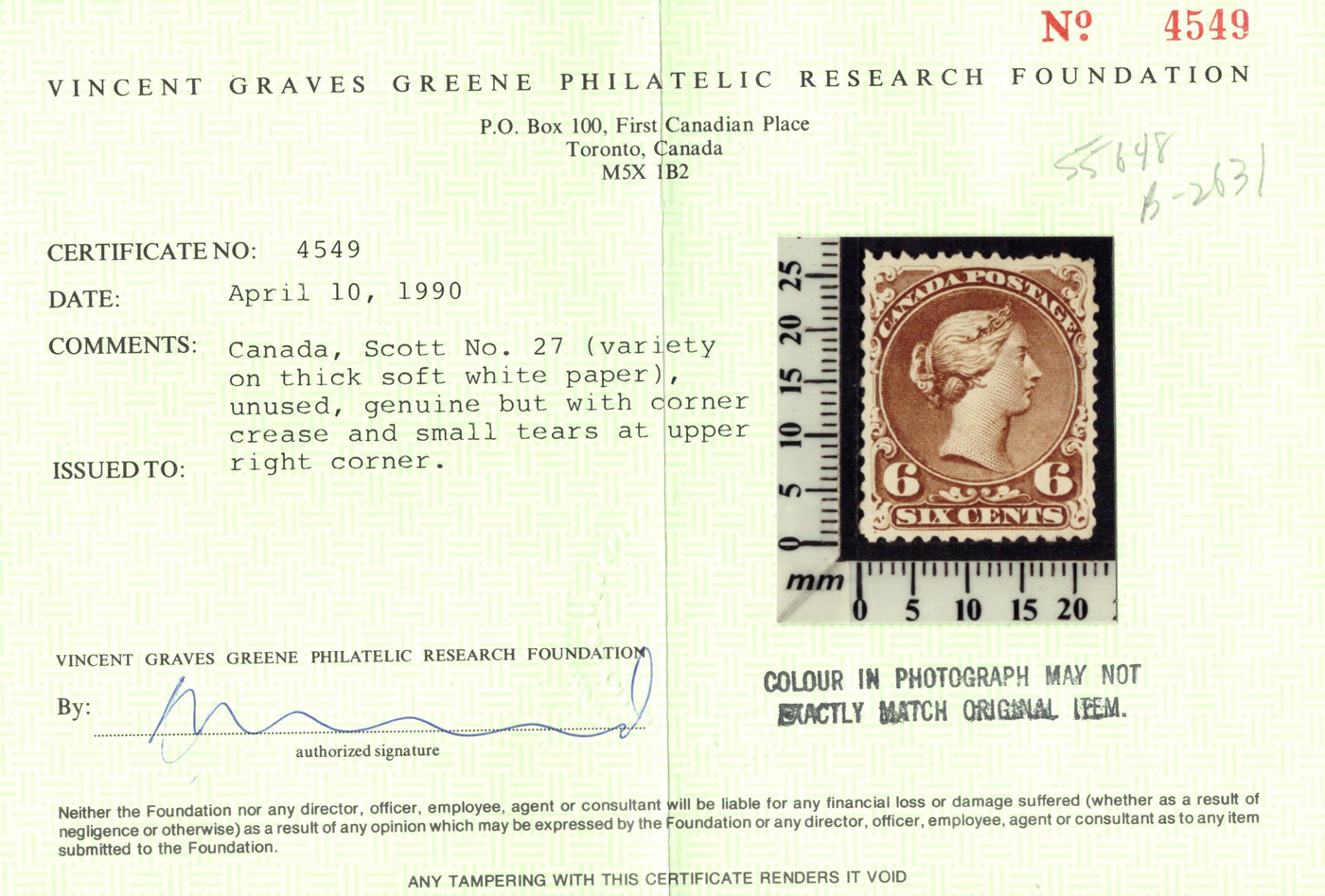 Queen on Soft White Blotting Paper, used with tiny trace of cancel, from plate 2 and showing an un-erased vertical guideline at left (through S of SIX and N of CANADA). Fine and scarce, accompanied by a 2006 Greene Foundation certificate. (Scan 1)