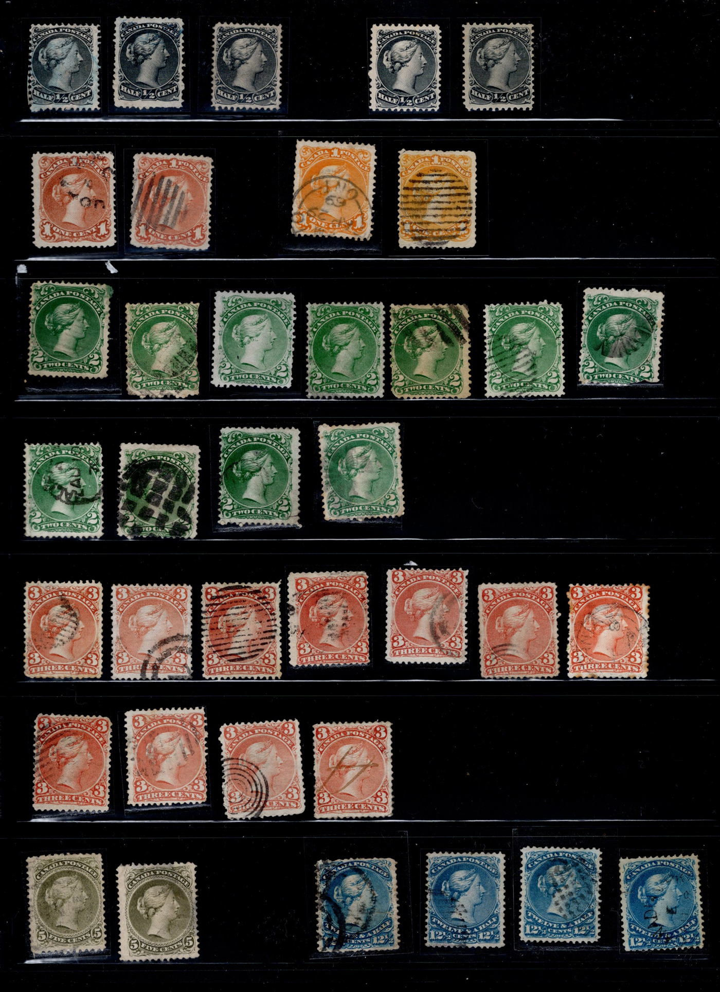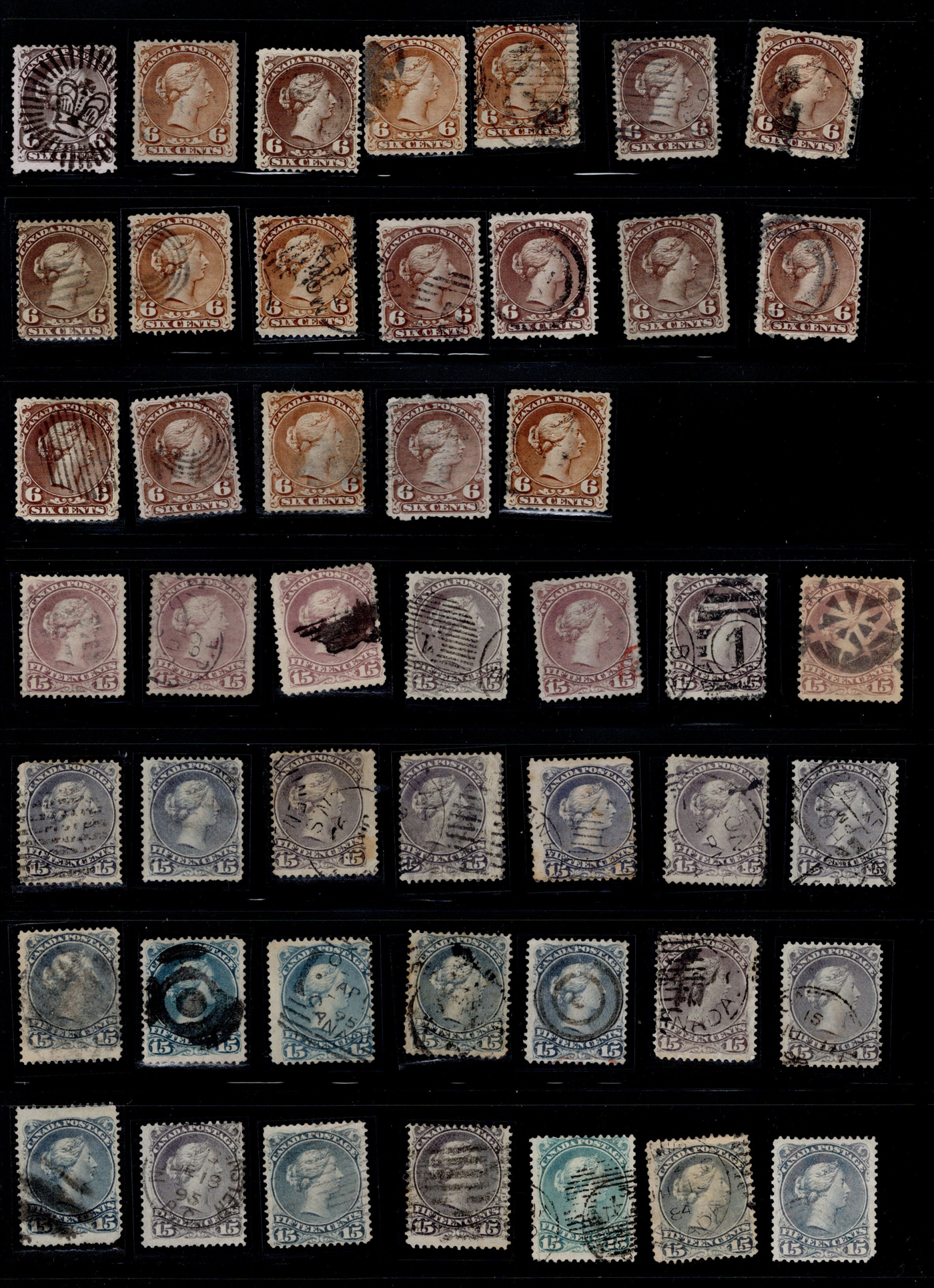 an overall clean and fine to very fine group, with many socked on the nose cancels. An ideal lot for the 15c Large Queen specialist. (Scan 1)