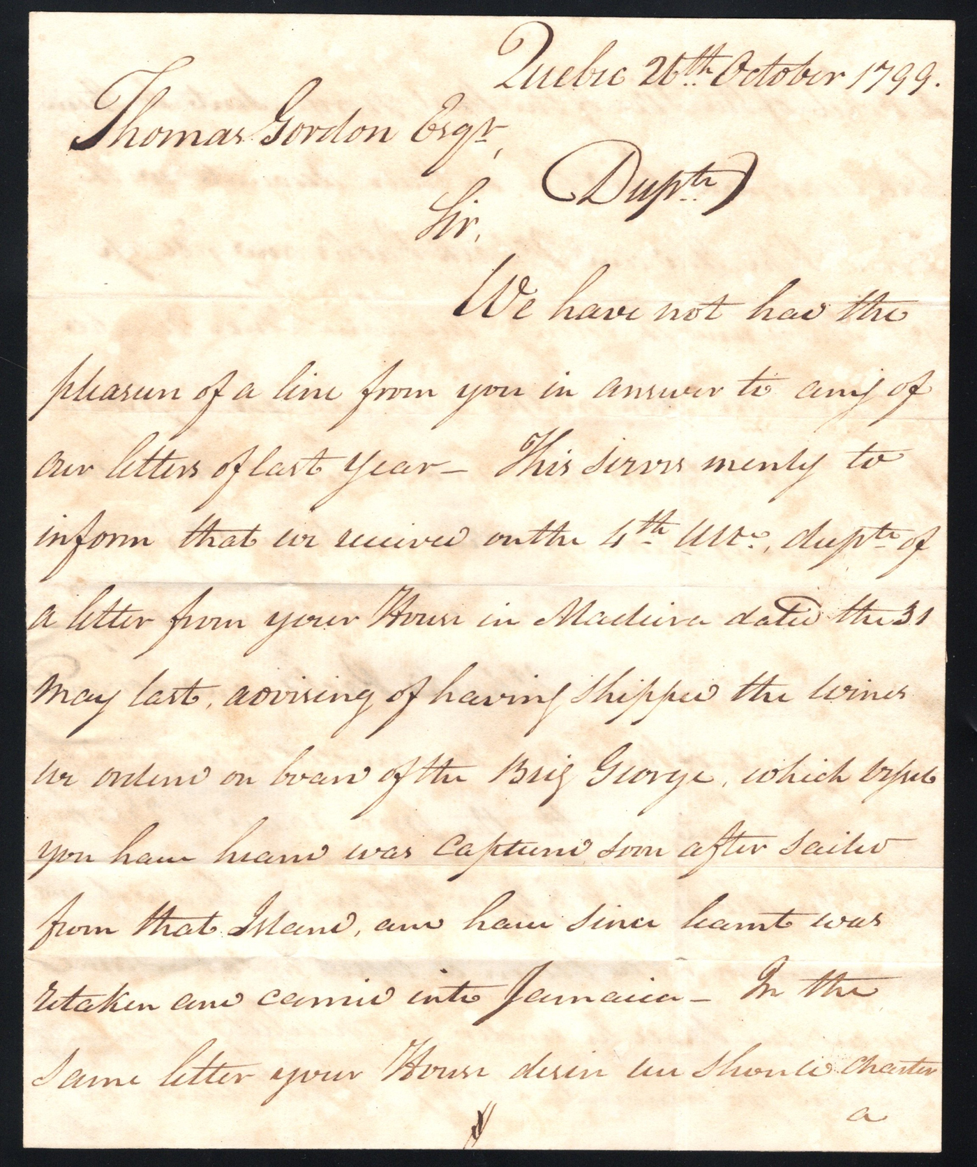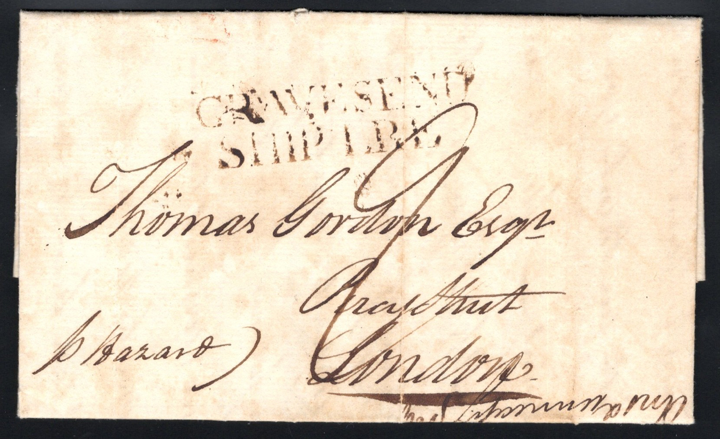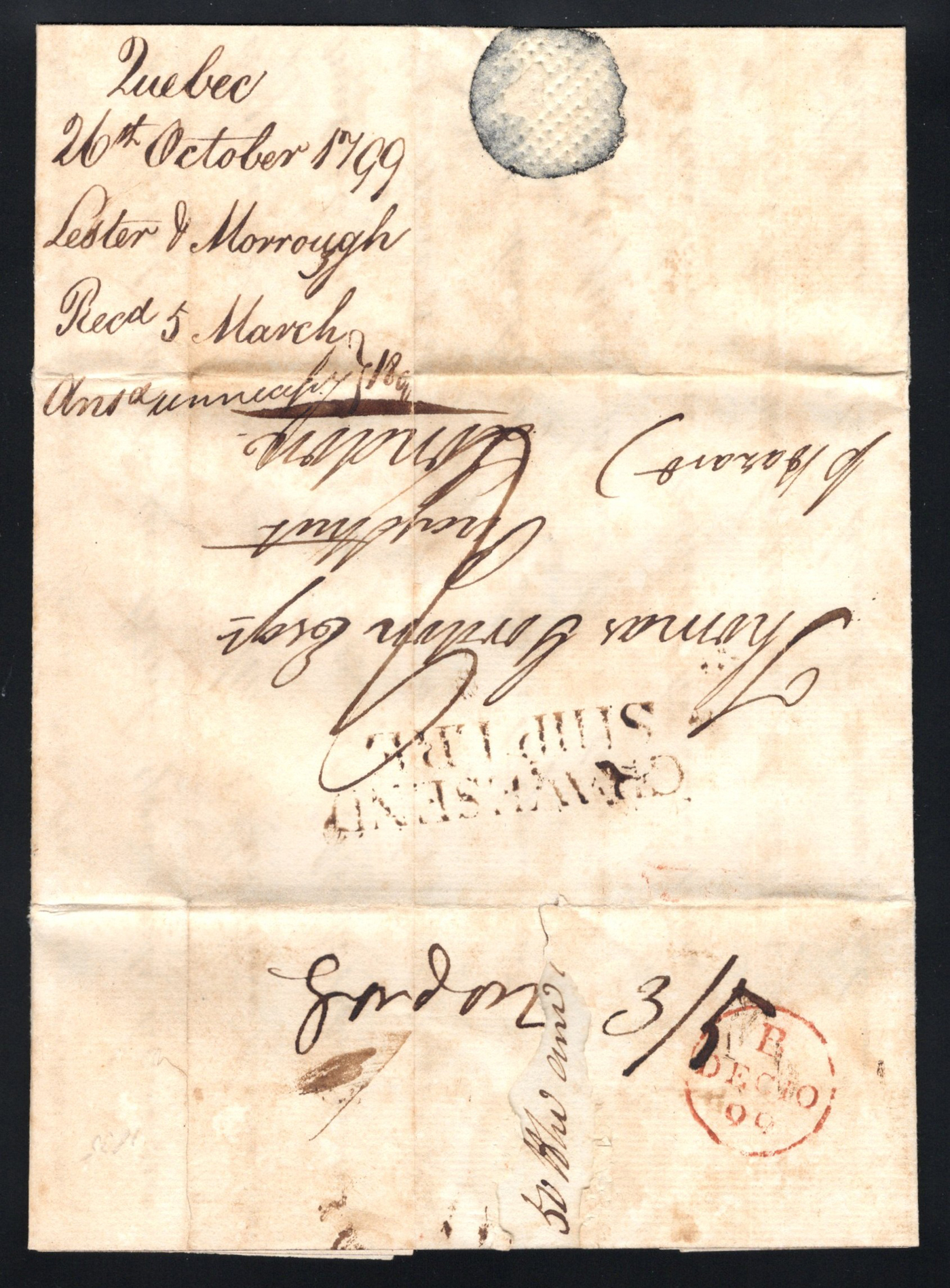 1078 CVR   image1799 Folded Letter Québec City to England, a neatly written three page letter datelined Québec 26th October 1799 addressed to London, England, with "GRAVESEND / SHIIP LRE" handstamp on front and DEC.10.99 circular receiver on back. Interesting message inside, mentioning in part that the sender had "...shipped some wine aboard the Big George, which was captured soon after it left that Island...". etc. Very fine, was sold to owner by Steinhart in 1989 for $575. (Scan 1) (Scan 2) (Scan 3) (All Scans)