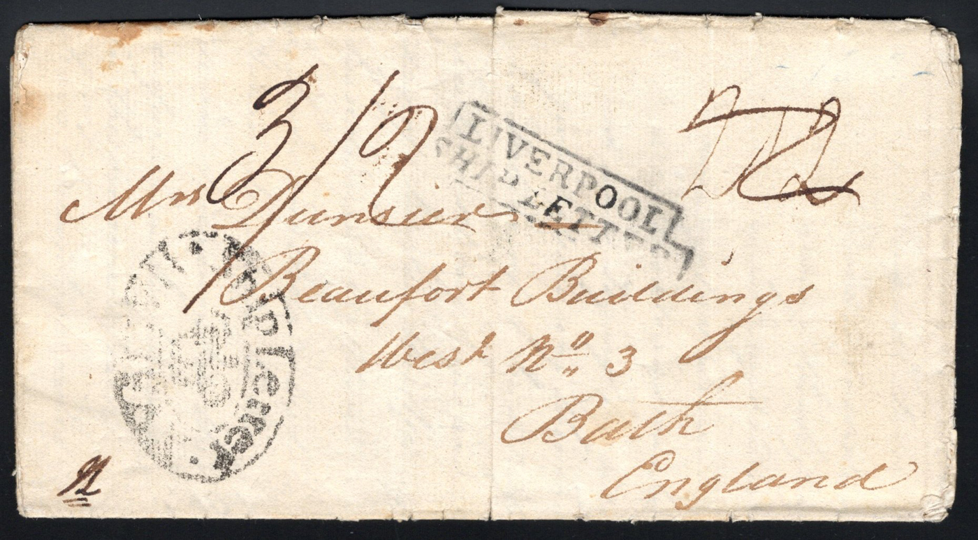 1080 CVR   image1818 Halifax Crown Ship Letter on Folded Letter to England, a two-page last will and testament (from William Lee, of Halifax) mailed to Bath, England, with a fine oval Ship Letter / Halifax crown handstamp in black, next to a boxed LIVERPOOL / SHIP LETTER also in black. Originally rated 2/2, struck out and replaced with 3/2, with wax seal in black. Creases and tears, still overall fine.