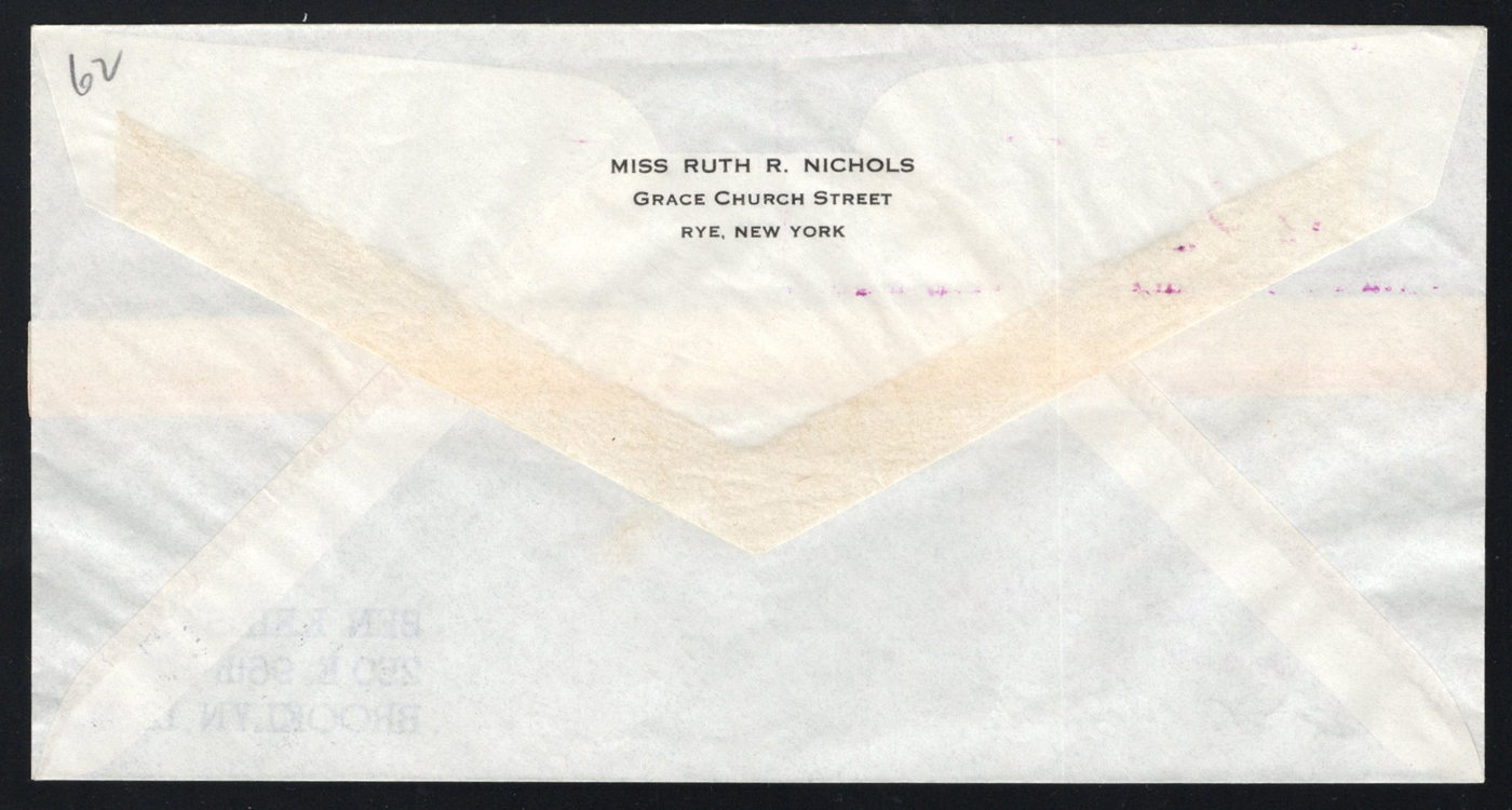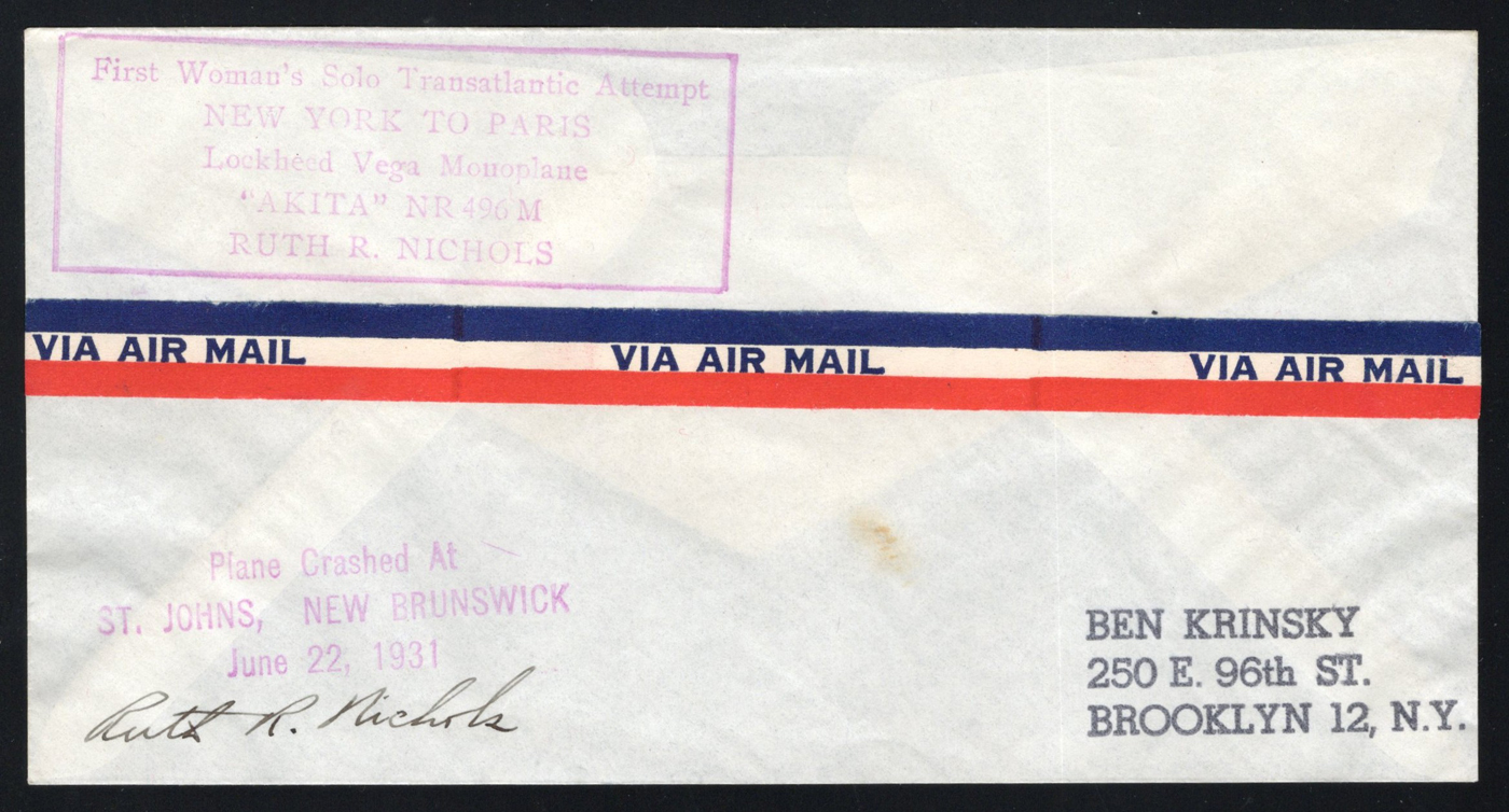 1061 CVR   image1931 First Woman's Solo Trans-Atlantic Attempt, Crashed in New Brunswick, an airmail envelope with Ruth Nichols (New York) return address on backflap, addressed to Ben Krinsky in New York, with flight cachet at top left reading "First Woman's Solo Transatlantic Attempt / New York to Paris / Lockheed Vega Monoplane / "Akita" NR 496 M / Ruth R. Nichols" alongside a handstamp reading "Plane Crashed At / St. Johns, New Brunswick / June 22, 1931" with pilot's signature below. The (new) American Airmail Catalogue describes this crash in part "she planned to refuel in St John, but on arriving at dusk, she realized that the landing strip was too short for her single-engine Lockheed Vega aircraft. She crash landed the plane, damaging the landing gear and fuselage, and suffered a broken vertebrae." Very fine and very scarce, ideal for any first flight, or crash cover collector. (Scan 1) (Scan 2) (All Scans)