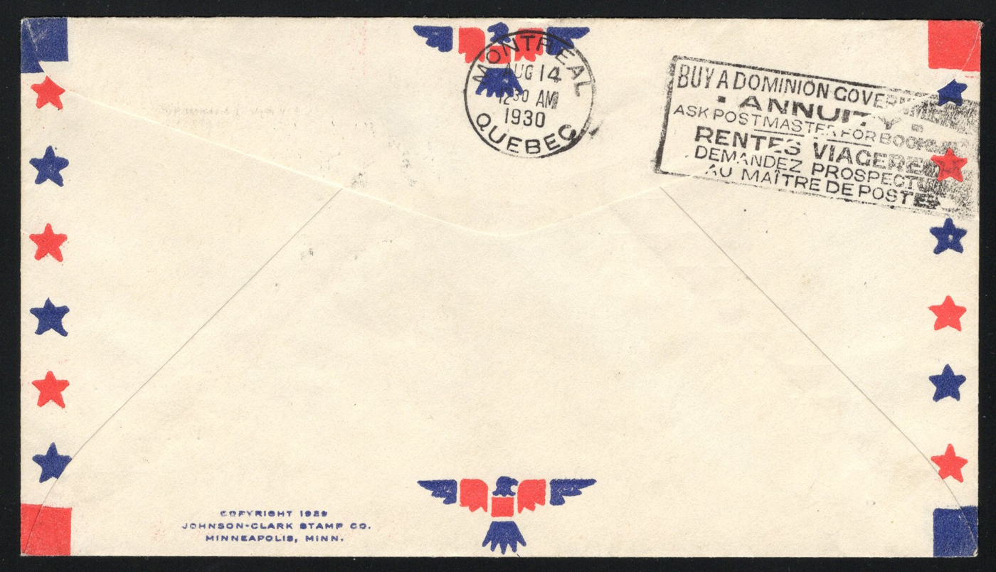1062 CVR   image1930 R-100 Cacheted Cover from St. Hubert, mailed Montréal / St. Hubert (AUG.1 and AUG.13.1930 c.d.s. in black) to Salem, NC, through Montréal AUG.14 (slogan machine transit on back), and missent to Guillford NC (manuscript notation plus faint c.d.s. on front), franked with #C1, very fine. The postmaster at St Hubert was authorized to backdate covers on these dates. Listed in AAMC2 at $250. (Scan 1) (Scan 2) (All Scans)